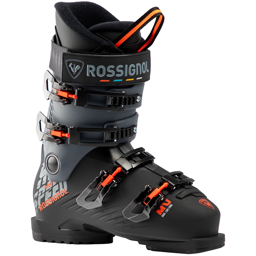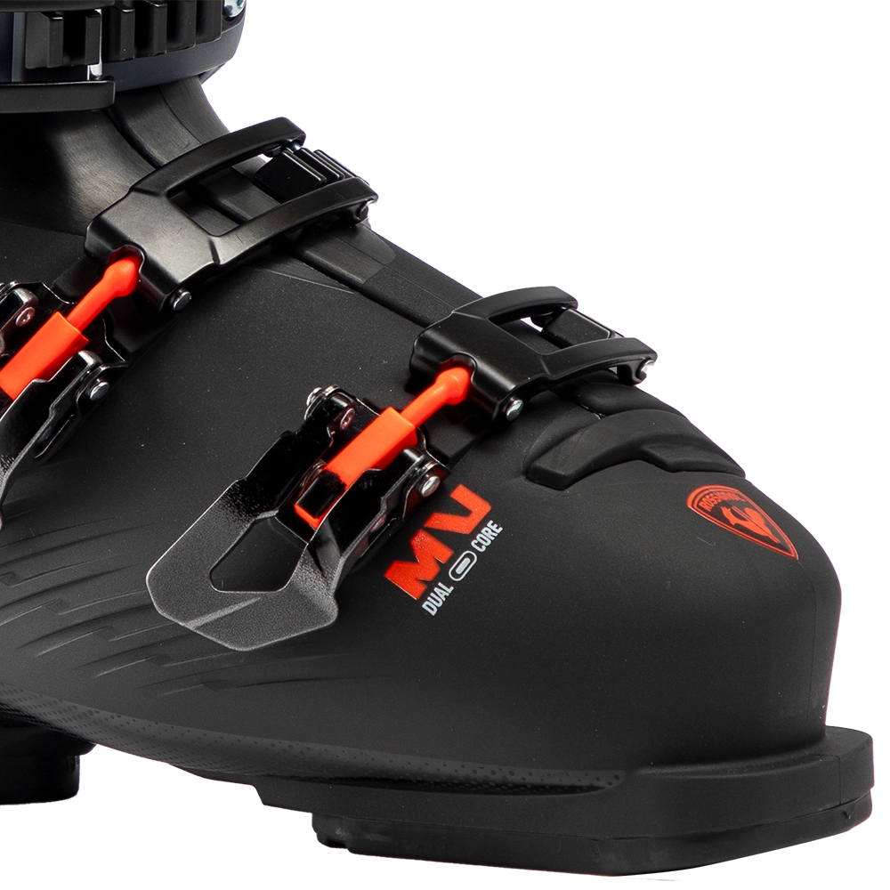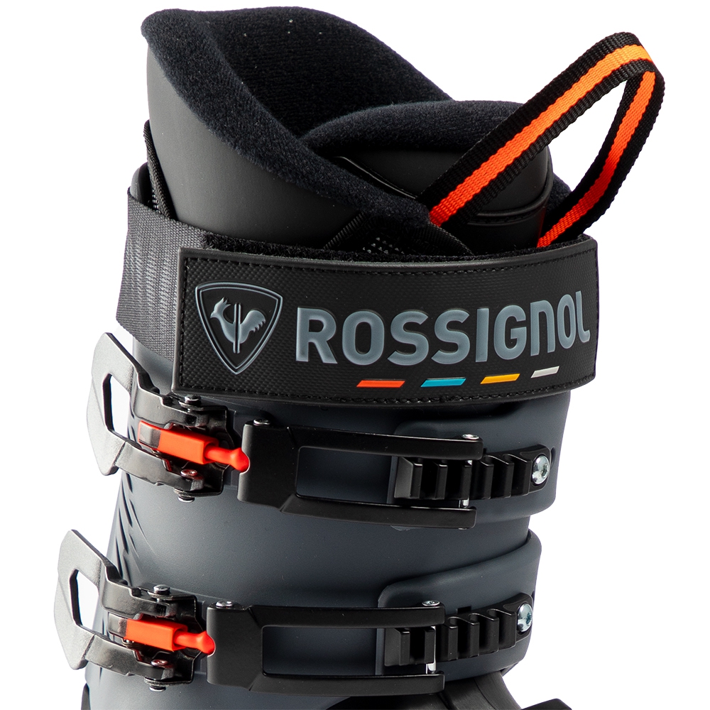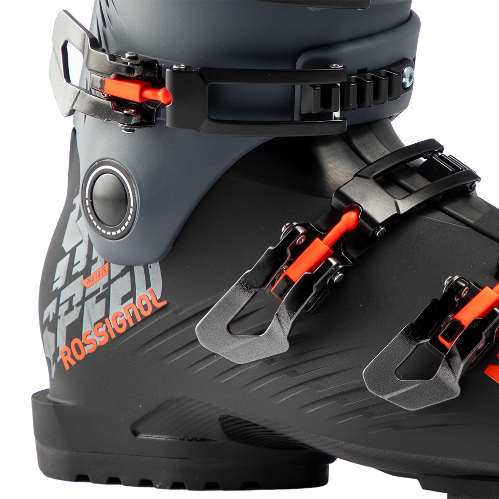 Liner został wykończony izolacją Thinsulate™, która dba o utrzymanie ciepła, dzięki czemu stopy pozostają ciepłe nawet w chłodniejsze dni. Bardzo istotnym elementem modelu Rossignol Hi-Speed Pro 70 JR MV jest system zapinania oparty na czterech aluminiowych klamrach z mikroregulacją, które pozwalają precyzyjnie ustawić siłę docisku i równomiernie dopasować but do nogi. Poza mikroregulacją buty mają także możliwość zmiany pozycji ząbków klamer czyniąc but jeszcze bardziej uniwersalnym. Całość uzupełnia szeroki pasek na rzep, poprawiający trzymanie górnej części nogi i stabilność podczas jazdy.