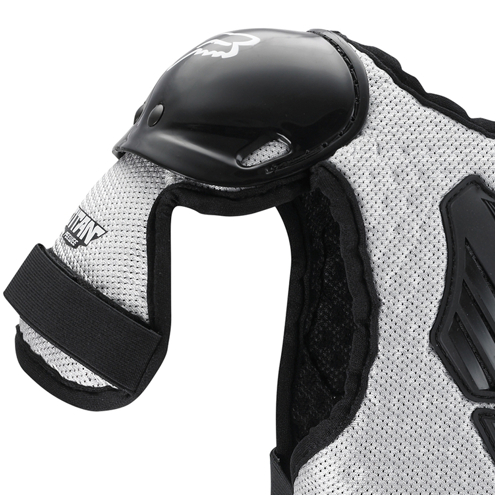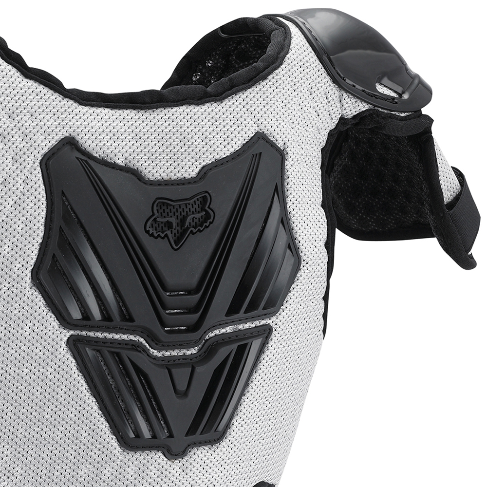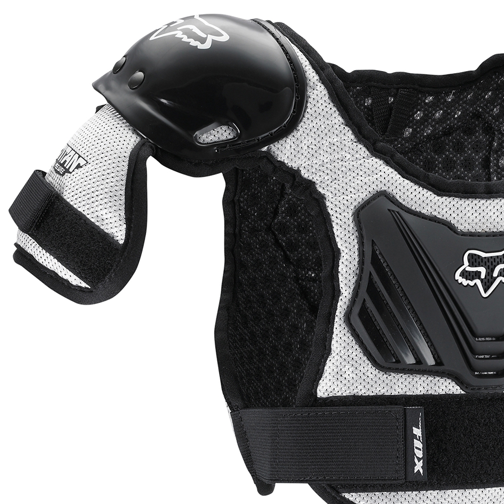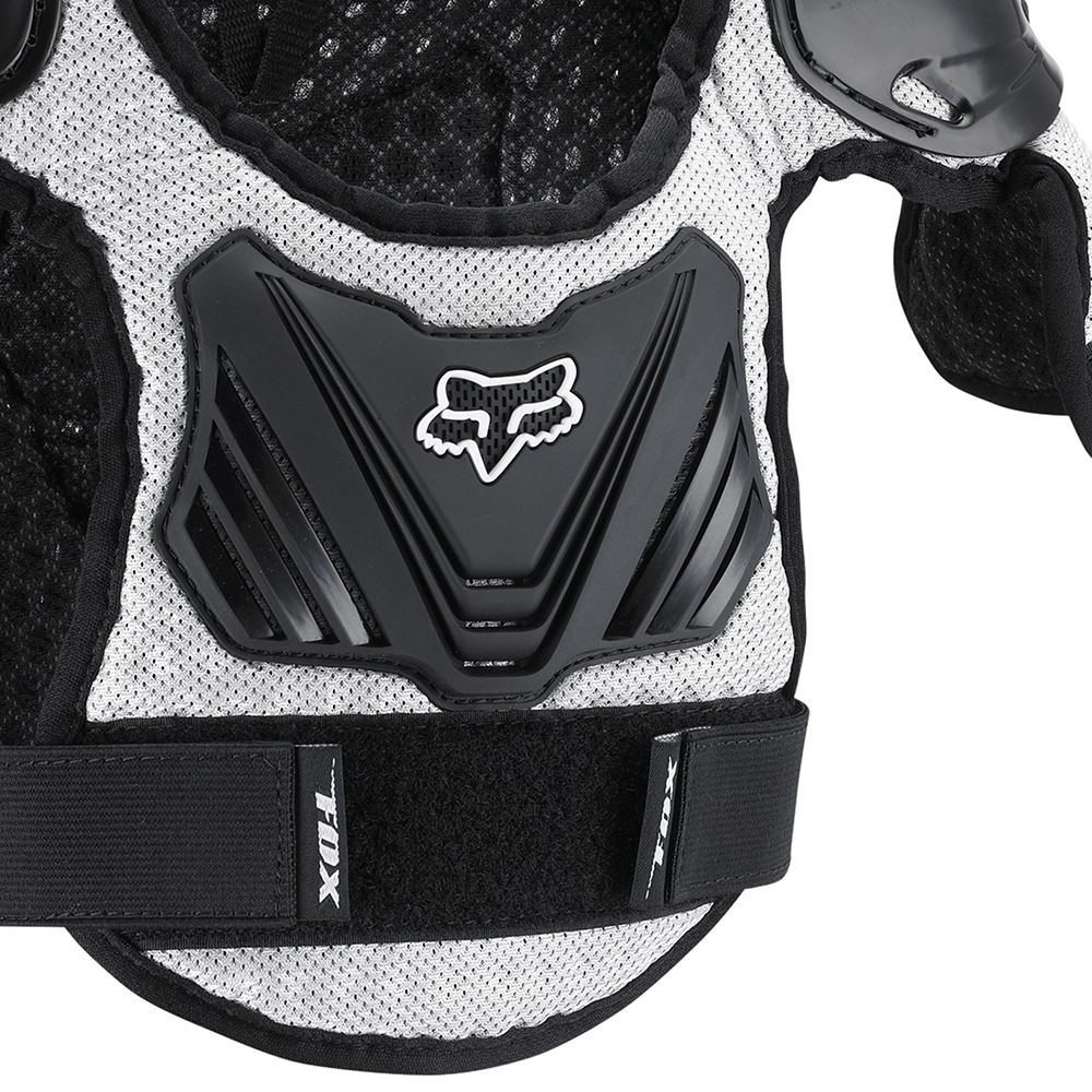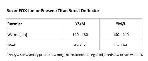 Buzer Fox Peewee Titan Roost Deflector stworzony został z myślą o bezpieczeństwie najmłodszych rowerzystów. Ochraniacz zapewnia solidną ochronę klatki piersiowej, pleców oraz ramion. Jego najważniejszymi elementami są strategicznie rozmieszczone twardymi panele z gumy oraz wtryskowymi plastikowymi nakładkami na ramionach. Takie rozwiązanie gwarantuje zarówno skuteczną absorpcję siły uderzeń, jak i swobodę ruchu. Wnętrze buzera wyłożono miękką pianką, co zwiększa komfort noszenia i minimalizuje ryzyko otarć podczas jazdy. Perforacje w piance poprawiają wentylację, zapobiegając nadmiernemu poceniu się w cieplejsze dni. Buzer FOX Peewee Titan Roost Deflector przeznaczony jest dla dzieci do 4 do 9 roku życia. Występują 2 dwóch rozmiarach: YS/M (4-7 lat) oraz YM/L (6-9 lat).