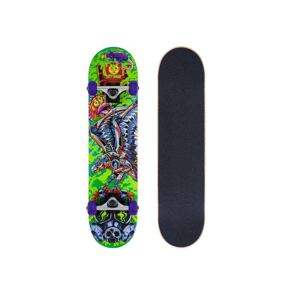 Deskorolka Tony Hawk 360 Series 7.5 to komplet dla osób początkujących i średniozaawansowanych, które chcą od razu wejść w świat deskorolki bez składania sprzętu. Bazą deskorolki jest deck o wymiarach 7.75” x 31”, wykonany z 7-warstwowego klonu Hardrock maple, co zapewnia dobrą wytrzymałość i sprężystość potrzebną przy nauce podstawowych tricków. Rozmiar ten jest najbardziej uniwersalny: sprawdzi się dla młodzieży i dorosłych o drobniejszej i średniej budowie, oferując dobry balans między stabilnością a zwrotnością. Klasyczny concave ułatwia kontrolę nad deską, szczególnie przy skrętach i wybiciach, a pełny grip OS780 na całej powierzchni gwarantuje pewne trzymanie stóp nawet przy dynamicznej jeździe. Deskorolkę Tony Hawk 360 Series 7.5 wyróżnia fakt, że jest w pełni gotowa do jazdy od razu po wyjęciu z opakowania, bez konieczności montażu czy regulacji.