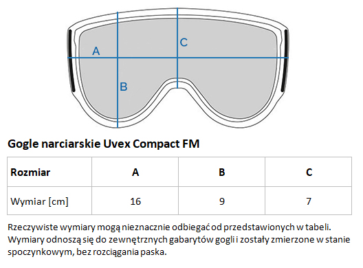 Gogle narciarskie Uvex Compact FM to wysokiej klasy gogle o smukłym, futurystycznym kształcie. Model ten wyróżnia się minimalistyczną ramką co pozwala na zmaksymalizowanie pola widzenia, a także czyni gogle bardziej atrakcyjnymi dla oka. Podwójna sferyczna soczewka, w którą zostały wyposażone gogle Uvex Compact FM wykonana została w technologii decentered lens. Dzięki temu wiernie oddaje faktyczny stan otrzymanego obrazu bez zniekształceń i załamań. Szybka posiada również innowacyjną powłokę supravision®. Jest to specjalna warstwa umieszczona na wewnętrznej stronie szyby gogli. Gwarantuje ona co najmniej dwukrotnie dłuższą i znacznie bardziej skuteczną ochronę przed parowaniem w porównaniu do standardowych szyb zgodnych z normą EN 174. Powłoka ta działa tak samo skutecznie niezależnie od warunków atmosferycznych. Soczewka gogli narciarskich Uvex Compact FM posiada kategorię S2 co oznacza, iż najlepiej sprawdzi się podczas jazdy w warunkach delikatnego zachmurzenia czy też słabego słońca.