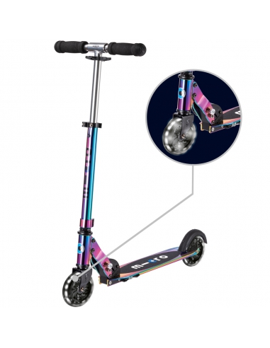 Hulajnoga Micro Sprite LED posiada kółka z wbudowanymi diodami, które świecą poprzez indukcję. Takie rozwiązania oznacza, iż aby kółka zaczęły się świecić trzeba jedynie lekko rozpędzić hulajnogę. Nie wymaga ona ładowania bądź wymiany baterii. Dwukołowa hulajnoga Micro Sprite LED dzięki świecącym kołom jest znacznie lepiej widoczna zwiększając bezpieczeństwo dziecka. Świecące koło daje również niesamowity efekt, który wyróżni hulajnogę spośród innych modeli, a także zachwyci wszystkie dzieci.
