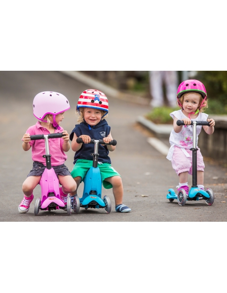Gdy wykorzystasz już w pełni możliwości jakie daje jeździk Micro Mini2Go Plus Deluxe, a Twoja pociecha ukończy 2 rok życia, czas na hulajnogę Mini Micro Deluxe w tradycyjnej, trójkołowej wersji. Wystarczy zdemontować siodełko i cieszyć się trójkołową hulajnogą. Płynnie regulowana w zakresie od 49 do 67 cm kierownica pozwoli korzystać z hulajnogi do 5 roku życia. Manewrowanie hulajnogą Mini Micro Deluxe odbywa się na zasadzie balansowania ciałem oraz przechylania drążka kierownicy. Ten sposób skrętu większość dzieci wykonuje intuicyjnie. Dziecko bez trudu panuje nad hulajnogą i świetnie się bawi. Przy okazji rozwija zmysł równowagi, koordynację ruchową i zdolności motoryczne.