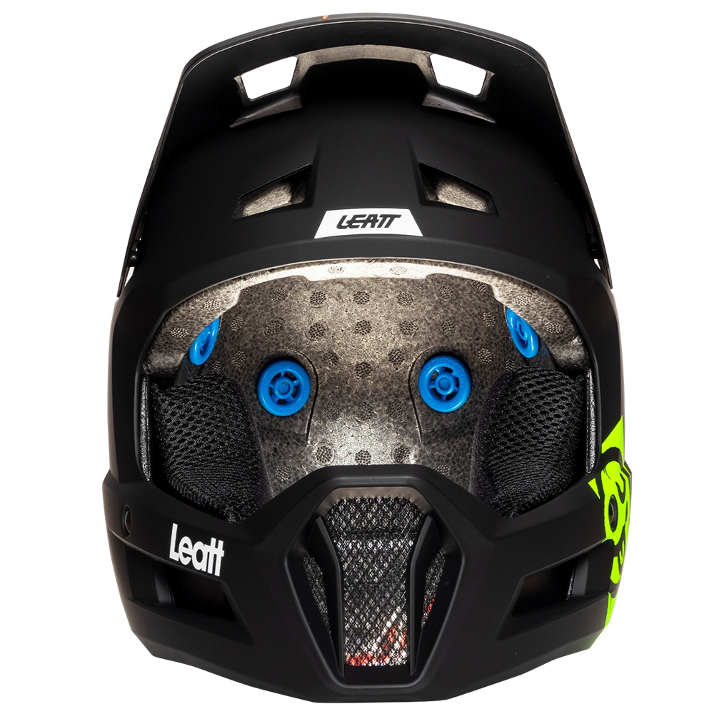 Stabilizacja i pewne osadzenie kasku jest niezwykle istotne, a w przypadku kasków full face ma odgrywa szczególnie wysoką rolę. Model Leatt MTB Gravity 1.0 Junior wyróżnia się pełnym wyścieleniem, na które składają się liczne, szerokie poduszki i wkładki. Stabilizują one zarówno głowę ridera jak i jego twarz oraz szczękę. Wyściółka kasku wykonana z miękkich materiałów, które nie tylko zapewniają dobre dopasowanie, a także dbają o komfort termiczny młodego ridera. Mają one cechy termoregulacyjne wspomagając odprowadzanie nadmiernej wilgoci. Ich perforowana struktura pozwala również na doprowadzanie świeżego, rześkiego powietrza. Całą wyściółkę wewnętrzną można z łatwością wyjąć i wyprać. Na wysokości żuchwy znajdują się dwie, odpowiednio profilowane poduszki szczękowe tzw. chin pads, które pełnią kluczową rolę w kwestii stabilizacji kasku. Co istotne, można je z łatwością wypiąć co może być szczególnie istotne w przypadku interwencji służb ratowniczych. Pod brodą umieszczono regulowany pasek, który posiada zapięcie typu DD. Jest ono stosowane również w kaskach motocyklowych. Są to dwie metalowe klamry, które po odpowiednim przełożeniu przez nie paska regulującego gwarantują stabilność kasku nawet podczas mocnego upadku. Rozwiązanie to jest niezwykle skuteczne, łatwe w obsłudze, a ponadto niemalże niemożliwe do zużycia bądź samoistnego rozregulowania. Kask cechuje się także wydajnym systemem wentylacji. Na skorupie znajduje się 9 odpowiednio rozmieszczonych otworów wspomagających ten proces.