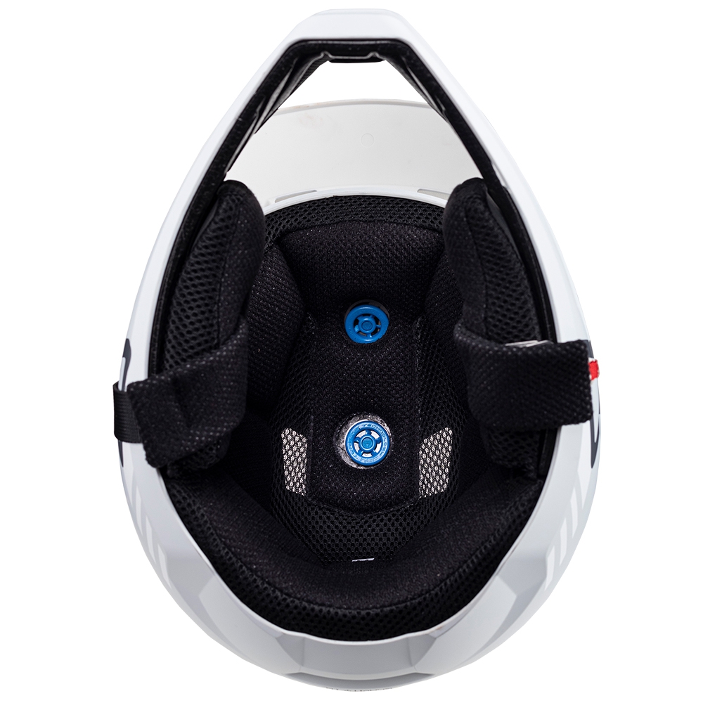 Stabilizacja i pewne osadzenie kasku jest niezwykle istotne, a w przypadku kasków full face ma odgrywa szczególnie wysoką rolę. Model Leatt MTB Gravity 1.0 wyróżnia się pełnym wyścieleniem, na które składają się liczne, szerokie poduszki i wkładki. Stabilizują one zarówno głowę ridera jak i jego twarz oraz szczękę. Wyściółka kasku wykonana z miękkich materiałów, które nie tylko zapewniają dobre dopasowanie, a także dbają o komfort termiczny młodego ridera. Mają one cechy termoregulacyjne wspomagając odprowadzanie nadmiernej wilgoci. Ich perforowana struktura pozwala również na doprowadzanie świeżego, rześkiego powietrza. Całą wyściółkę wewnętrzną można z łatwością wyjąć i wyprać. Na wysokości żuchwy znajdują się dwie, odpowiednio profilowane poduszki szczękowe tzw. chin pads, które pełnią kluczową rolę w kwestii stabilizacji kasku. Co istotne, można je z łatwością wypiąć co może być szczególnie istotne w przypadku interwencji służb ratowniczych. Pod brodą umieszczono regulowany pasek, który posiada zapięcie typu DD. Jest ono stosowane również w kaskach motocyklowych. Są to dwie metalowe klamry, które po odpowiednim przełożeniu przez nie paska regulującego gwarantują stabilność kasku nawet podczas mocnego upadku. Rozwiązanie to jest niezwykle skuteczne, łatwe w obsłudze, a ponadto niemalże niemożliwe do zużycia bądź samoistnego rozregulowania. Kask cechuje się także wydajnym systemem wentylacji. Na skorupie znajduje się 11 odpowiednio rozmieszczonych otworów wspomagających ten proces.