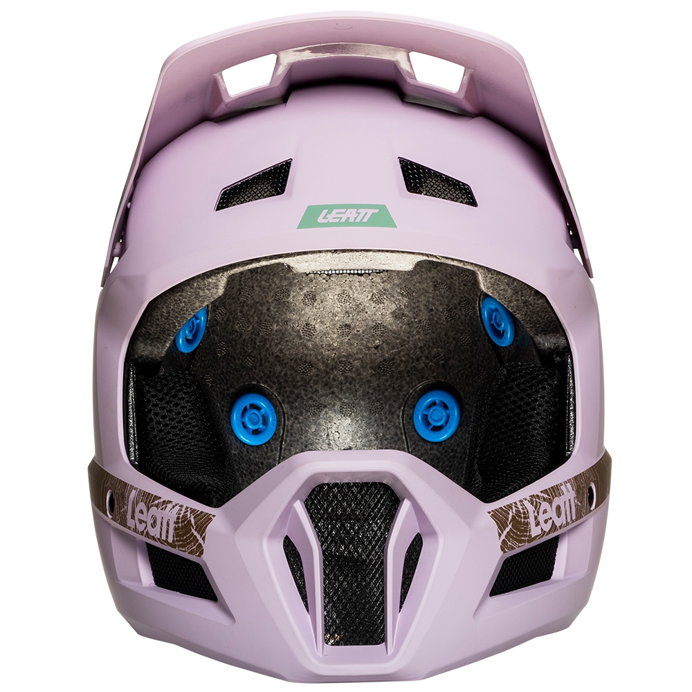 Model Leatt Gravity 2.0 wyróżnia się premium wyściółką, która zapewnia dłuższą żywotność, lepsze odprowadzanie wilgoci i komfort termiczny, w porównaniu do wersji 1.0. Składa się z licznych, szerokich poduszek i wkładek stabilizujących głowę ridera oraz twarz i szczękę. Wyściółka jest pokryta stalową siatką w otworach wentylacyjnych, co zwiększa ochronę przed kamieniami, brudem i złymi warunkami pogodowymi. Jej perforowana struktura pozwala również na doprowadzanie świeżego powietrza, dzięki czemu kask sprawdza się nawet w gorące dni. Całą wyściółkę wewnętrzną można łatwo wyjąć i wyprać. Na wysokości żuchwy znajdują się dwie, odpowiednio profilowane poduszki szczękowe tzw. chin pads, które pełnią kluczową rolę w stabilizacji kasku i mogą być łatwo wypięte w sytuacjach awaryjnych. Pod brodą umieszczono regulowany pasek z zapięciem typu DD, zapewniający maksymalną stabilność podczas mocnego upadku. Kask cechuje się także wydajnym systemem wentylacji – na skorupie znajduje się 11 odpowiednio rozmieszczonych otworów wspomagających przepływ powietrza.