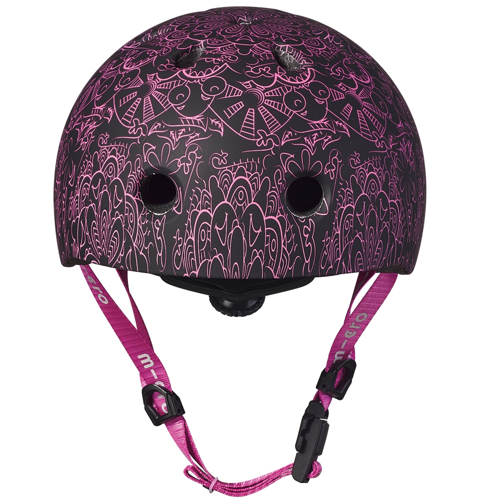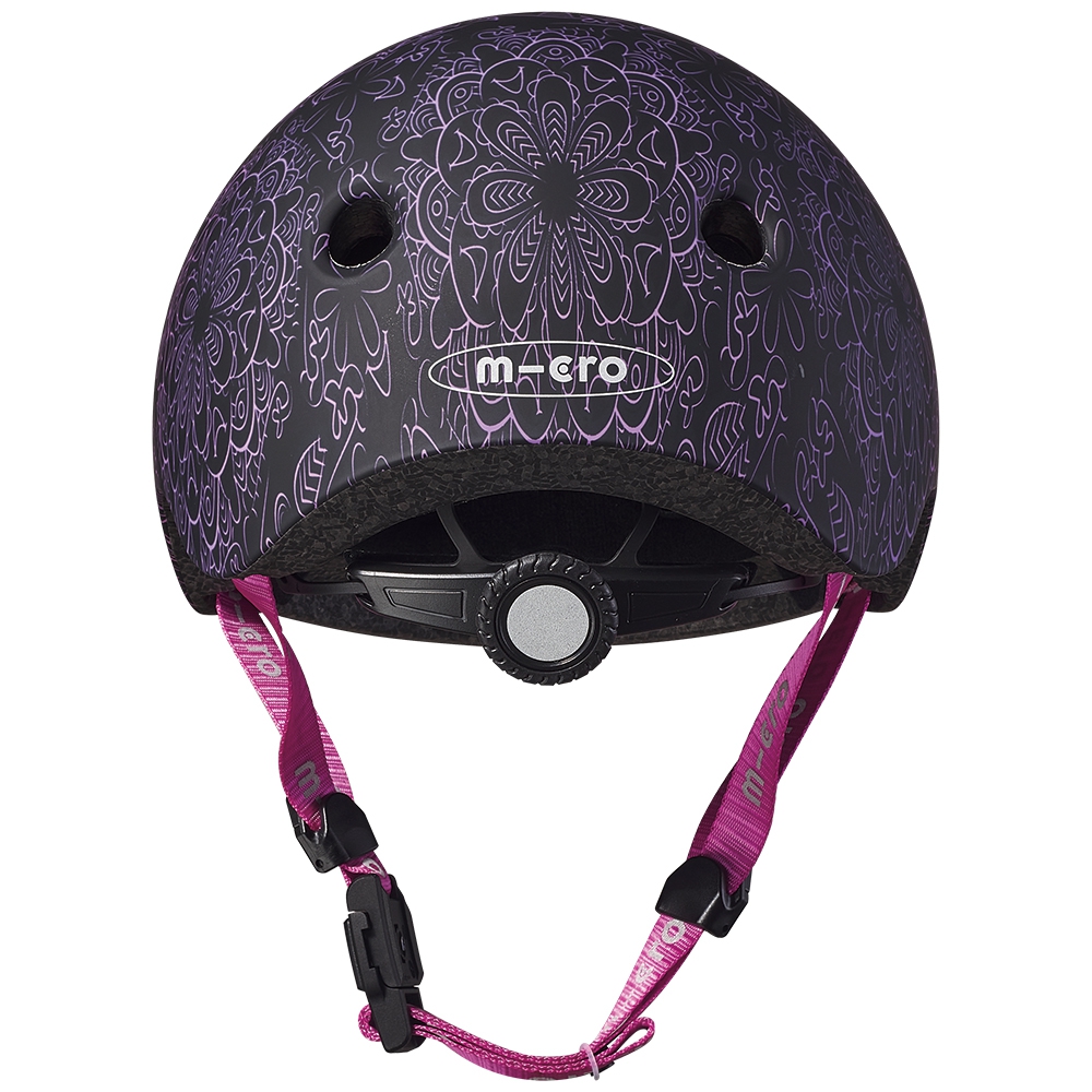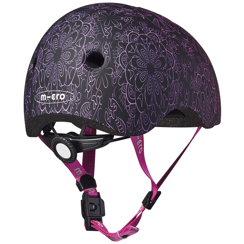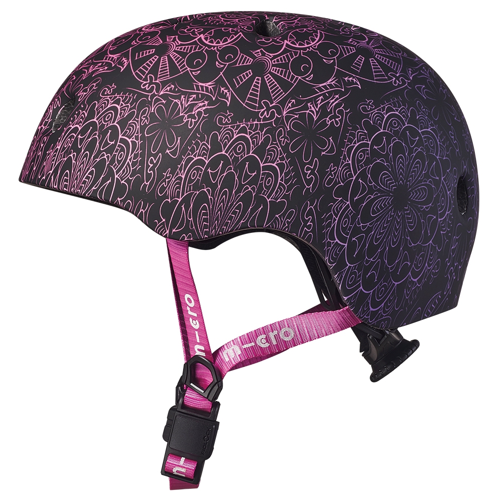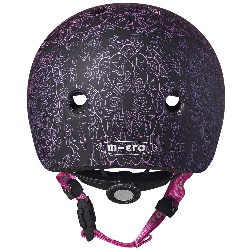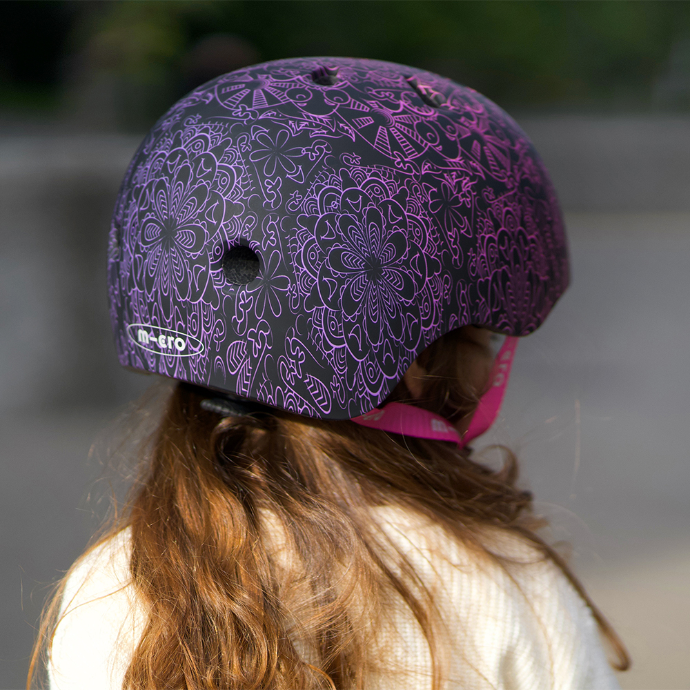 Kaski Micro projektowane są z myślą o najmłodszych, aby zapewnić im bezpieczeństwo podczas aktywnego spędzenia czasu na hulajnodze, rowerze, rowerku biegowym, rolkach lub deskorolce. Zamysłem kasku typu 'orzeszek' jest ochrona największej części głowy oraz przede wszystkim ochrona potylicy – to właśnie w aktywnościach typu jazda na hulajnodze, rolkach czy na deskorolce większość upadków jest właśnie do tyłu i naraża tył głowy na obrażenia. Wyzwaniem dla producenta jest, aby w parze z maksymalną ochroną głowy szła również jak najniższa waga, szczególnie że dzieci mogą nie zrozumieć, że jest to dla ich dobra i szybko się zrażą, jeśli kask będzie im za bardzo ciążył na głowie. Dlatego właśnie Micro zdecydowało się użyć pianki EPS jako wypełnienia wewnętrznego po to, aby zachować maksimum bezpieczeństwa, a jednocześnie stworzyć kask, który będzie lekki. EPS to pianka o różnej gęstości, która absorbuje energię uderzenia. Zewnętrzna skorupa kasku wykonana z poliwęglanu PC zapewnia wysoką odporność na uderzenia i doskonale uzupełnia się z pianką EPS, tworząc bardzo bezpieczną strukturę. Kask Micro Mandala występuje w rozmiarze: M (54-58 cm).