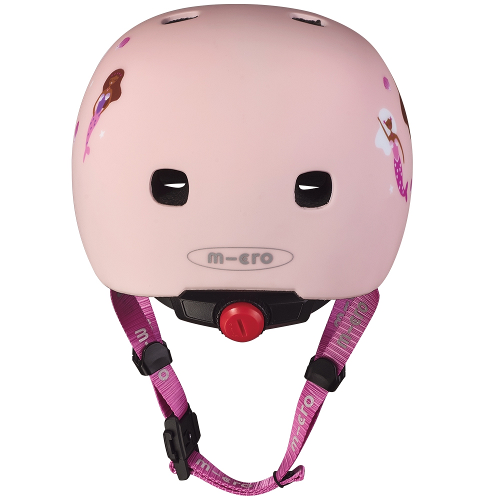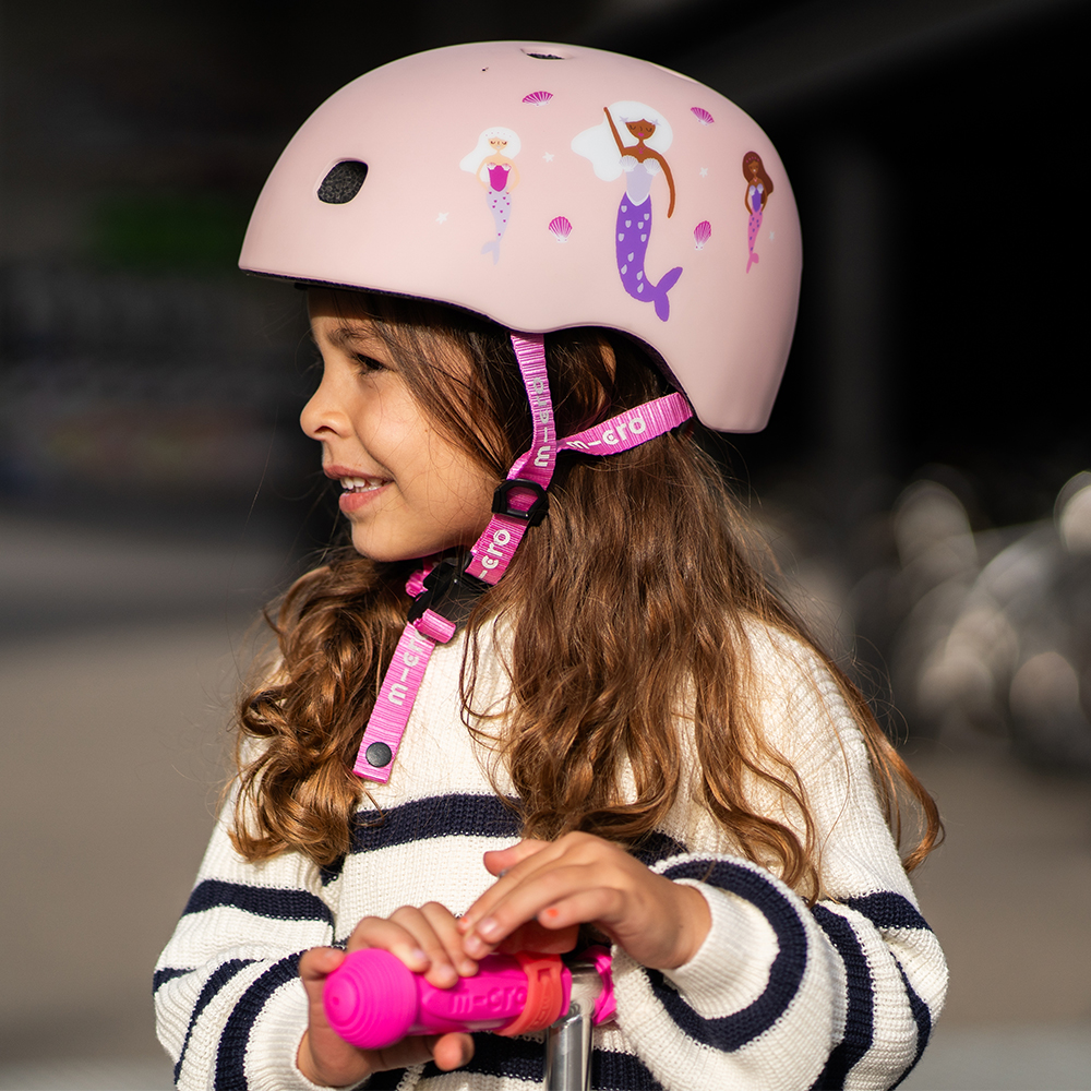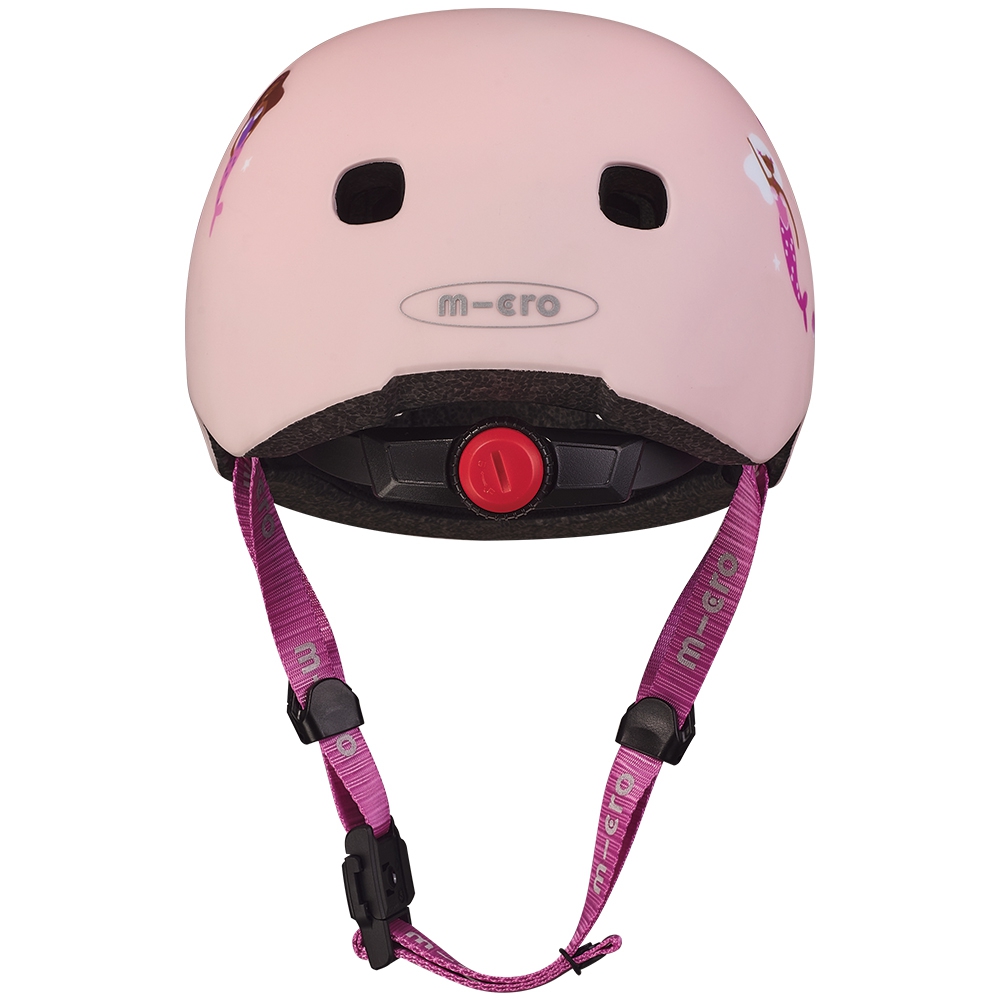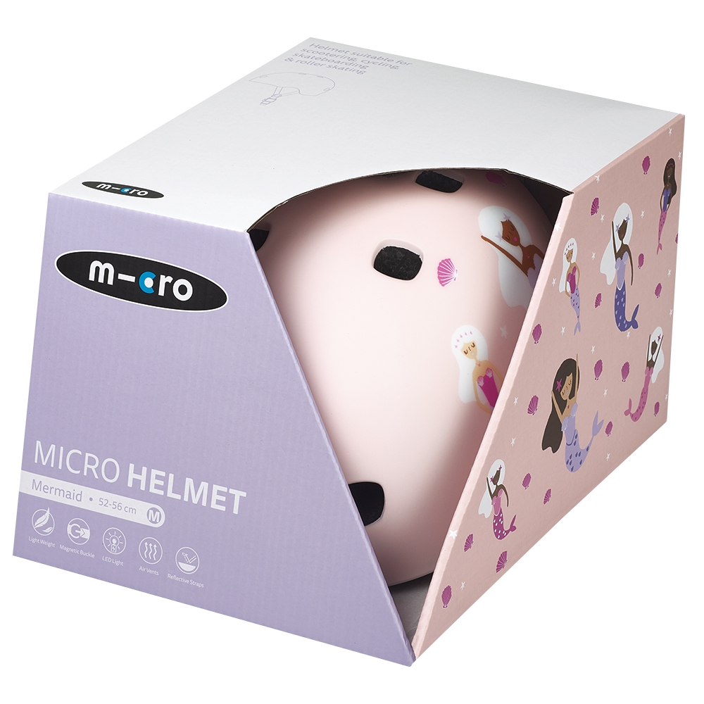Micro widząc, jak wielką popularnością cieszą się ich dziecięce kaski, postanowiło zaprojektować kask od nowa, jest to udoskonalona i poprawiona wersja klasycznego już kasku. Dużym usprawnieniem jest coraz częściej stosowane i uznane zapięcie na magnes, dzięki czemu już nigdy nie zdarzy się niechcący przyciąć brody. A do tego to rozwiązanie pozwala użytkować zapięcie jedną ręką bez konieczności męczenia się z przyciskami – wystarczy tylko wysunąć jedną część z drugiej palcem. Lampka zamontowana w pokrętle regulacji jest bardzo bezpiecznym pomysłem. Posiada aż trzy tryby świecenia – pojedyncze migające światełko, 4 migające światełka oraz światło ciągłe - dzięki temu dziecko po zmroku będzie z daleka widoczne. Ulepszona została również szata graficzna kasków. Kształt kasku jest teraz bardziej smukły oraz posiada inaczej ułożone otwory wentylacyjne – są umieszczone wzdłuż kasku, zapewniając jeszcze lepszą wentylację.