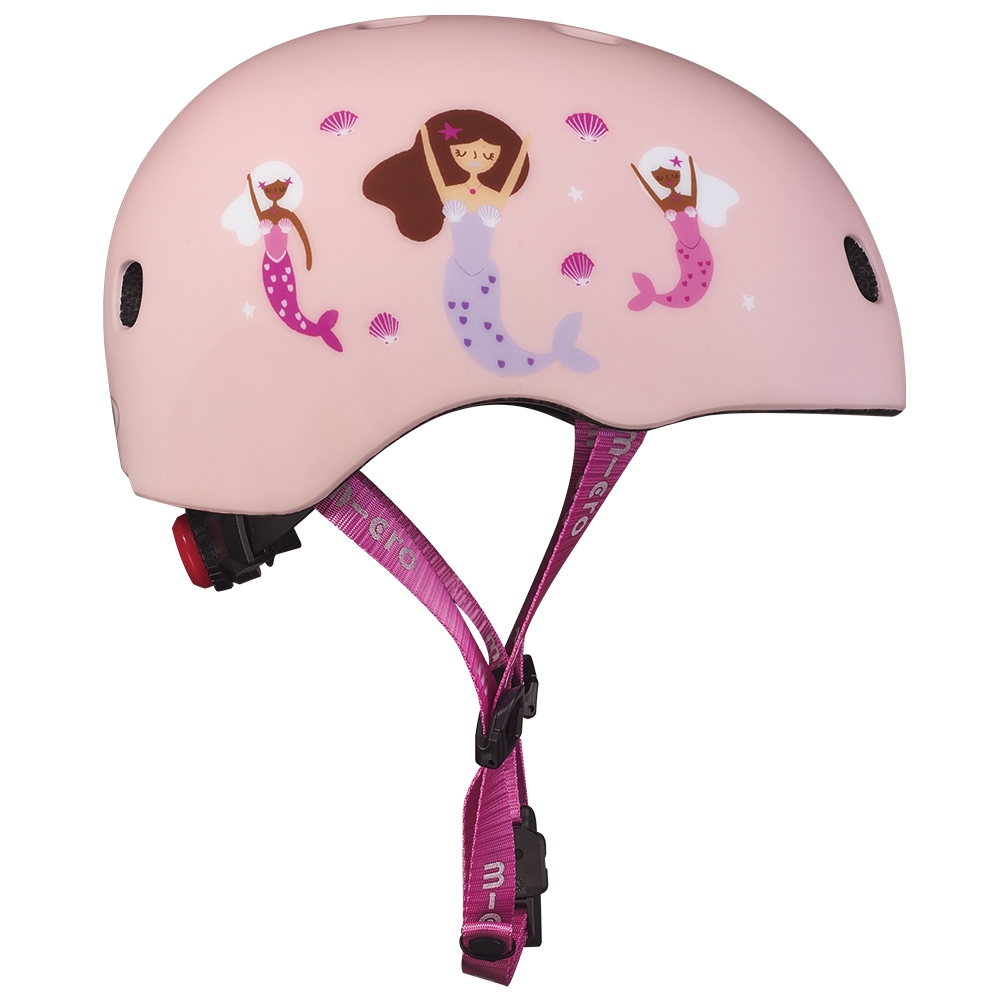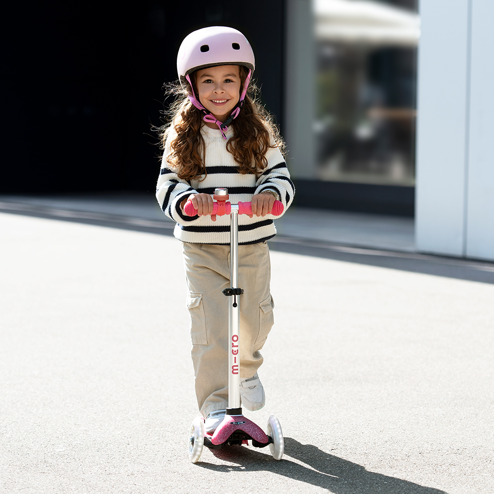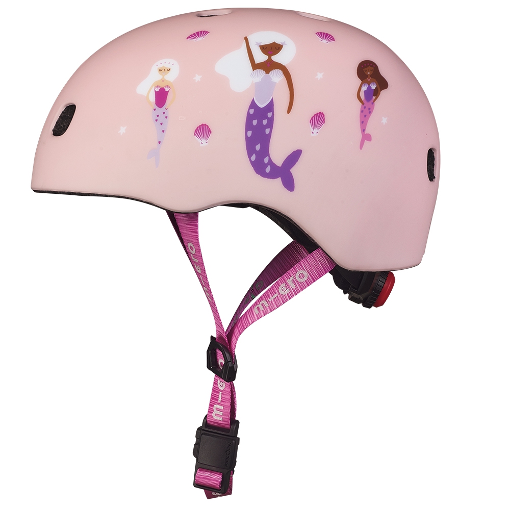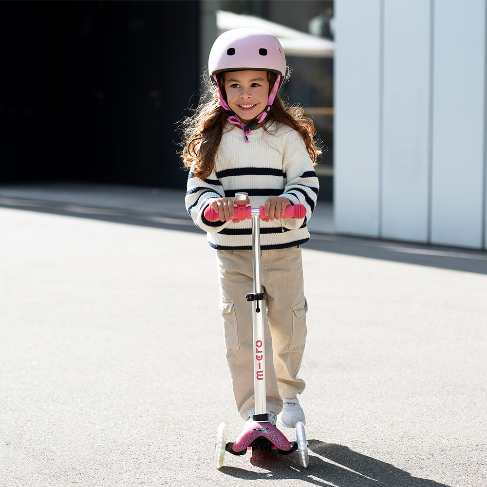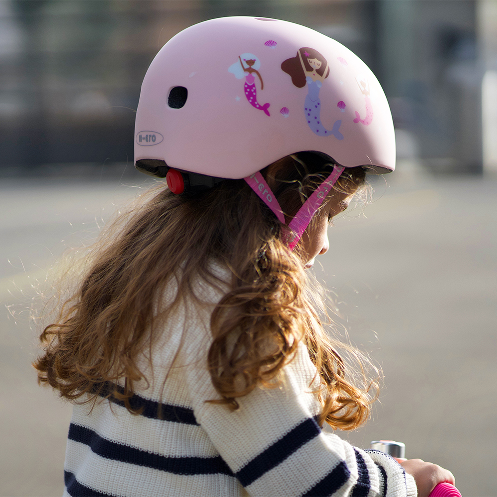 Micro widząc, jak wielką popularnością cieszą się ich dziecięce kaski, postanowiło zaprojektować kask od nowa, jest to udoskonalona i poprawiona wersja klasycznego już kasku. Dużym usprawnieniem jest coraz częściej stosowane i uznane zapięcie na magnes, dzięki czemu już nigdy nie zdarzy się niechcący przyciąć brody. A do tego to rozwiązanie pozwala użytkować zapięcie jedną ręką bez konieczności męczenia się z przyciskami – wystarczy tylko wysunąć jedną część z drugiej palcem. Lampka zamontowana w pokrętle regulacji jest bardzo bezpiecznym pomysłem. Posiada aż trzy tryby świecenia – pojedyncze migające światełko, 4 migające światełka oraz światło ciągłe - dzięki temu dziecko po zmroku będzie z daleka widoczne. Ulepszona została również szata graficzna kasków. Kształt kasku jest teraz bardziej smukły oraz posiada inaczej ułożone otwory wentylacyjne – są umieszczone wzdłuż kasku, zapewniając jeszcze lepszą wentylację.