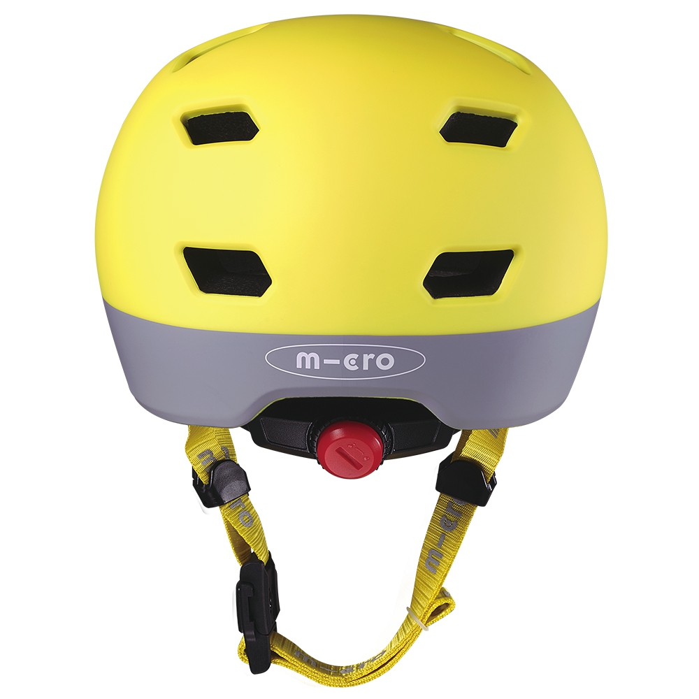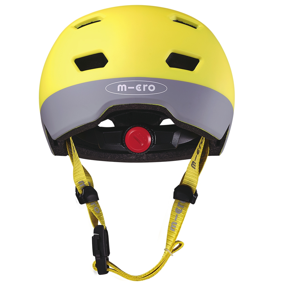 Kask Micro Neon posiada precyzyjny system regulacji dzięki czemu sprawdzi się na każdej głowie. Dopasowanie kasku odbywa się przy pomocy pokrętła umieszczonego w tylnej części skorupy. Działa ono bardzo płynnie i bez problemów junior sam wyreguluje swój kask. W pokrętle umieszczono także wbudowaną lampkę LED, zapewniającą widoczność dziecka po zmroku. Regulowane paski pod brodą stabilizujące cały kask na głowie wyposażono w magnetyczne zapięcie Fidlock®, które ułatwia szybkie i bezpieczne zapinanie kasku bez ryzyka przycięcia skóry. Kask Micro Neon posiada miękkie wyścielenie, które zapobiega otarciom i czyni noszenie go znacznie przyjemniejszym.