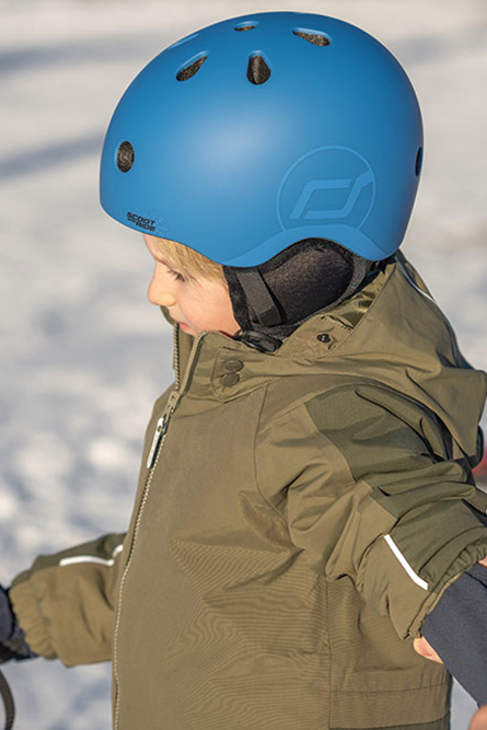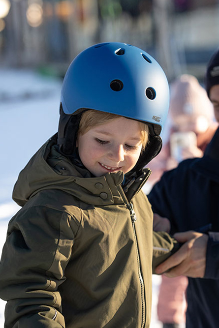 Idealne dopasownaie dopasowanie kasku jest równie istotne jak jakość jego wykonania. Kask narciarski ScootAndRide Ski Helmet został wyposażony w precyzyjny i prosty w obsłudze system regulacji obwodu, który umożliwia idealne dopasowanie kasku do głowy dziecka. Regulacja odbywa się za pomocą elastycznej obejmy oraz wygodnego pokrętła umieszczonego z tyłu kasku w zakresie od 51 do 55 cm. Wnętrze kasku wyłożono miękką, polarową wyściółką, która zapewnia komfort cieplny oraz chroni przed otarciami. Wkładka jest wyjmowana i nadaje się do prania. Regulowany pasek pod brodą posiada miękką poduszeczkę oraz magnetyczne zapięcie, które umożliwia szybkie zapinanie jedną ręką i zapobiega przycięciu skóry.