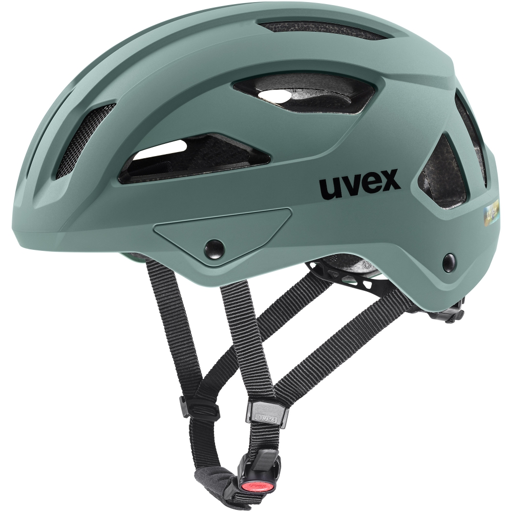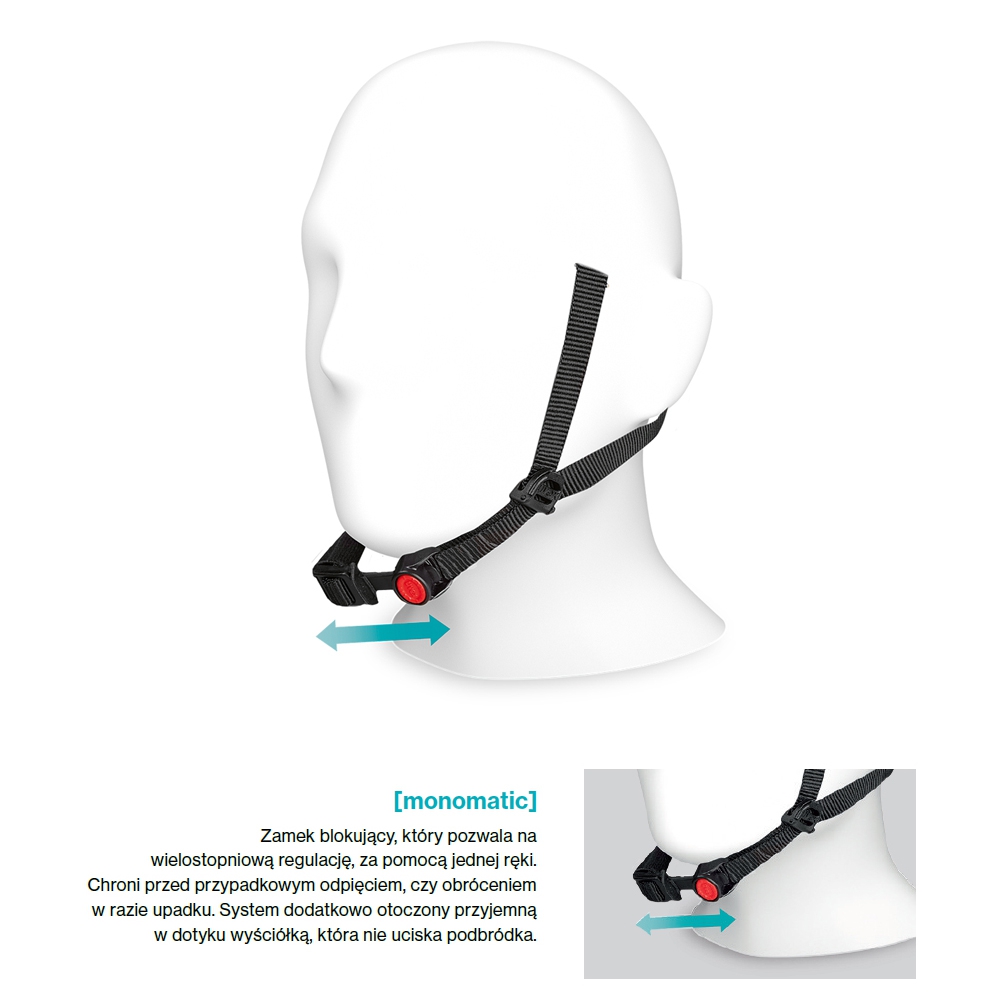 Niemniej ważnym aspektem jest mocowanie kasku na głowie. W kaskach Uvex odpowiada za ten aspekt odpowiada komfortowe zapięcie uvex monomatic czyli dopasowanie długości pasków mocujących. Dzięki tej regulacji kask leży mocno na głowie, nie mając możliwości zsunięcia się nawet podczas uderzenia. Pasek podbródka posiada dodatkową regulację, znajduje się on w miękkiej, komfortowej osłonie aby nie uciskać szyi oraz ukryć nadmiar paska. Zamek blokujący (sprzączka) posiada wielostopniową regulację, do odpięcia kasku i regulacji paska podbródka wystarczy jedna ręka. Robi się to przez naciśnięcie przycisku. Rozwiązanie to tzw. system monomatic chroni przed przypadkowym odpięciem kasku.