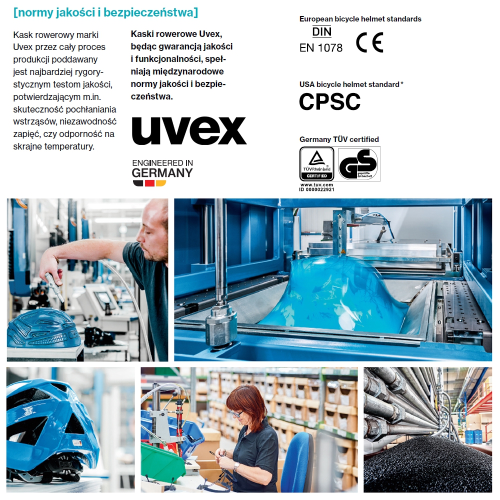 Kaski rowerowe marki Uvex odpowiadają najwyższym wymaganiom bezpieczeństwa i jakości zgodnie z normami: CE, TÜV GS, EN 1078. Podczas całego procesu produkcji kask poddawany jest rygorystycznym testom potwierdzającym m.in. skuteczność pochłaniania wstrząsów, promieni UV czy niezawodność zapięć. Kask Uvex zapewnia najwyższą ochronę głowy przed urazem.