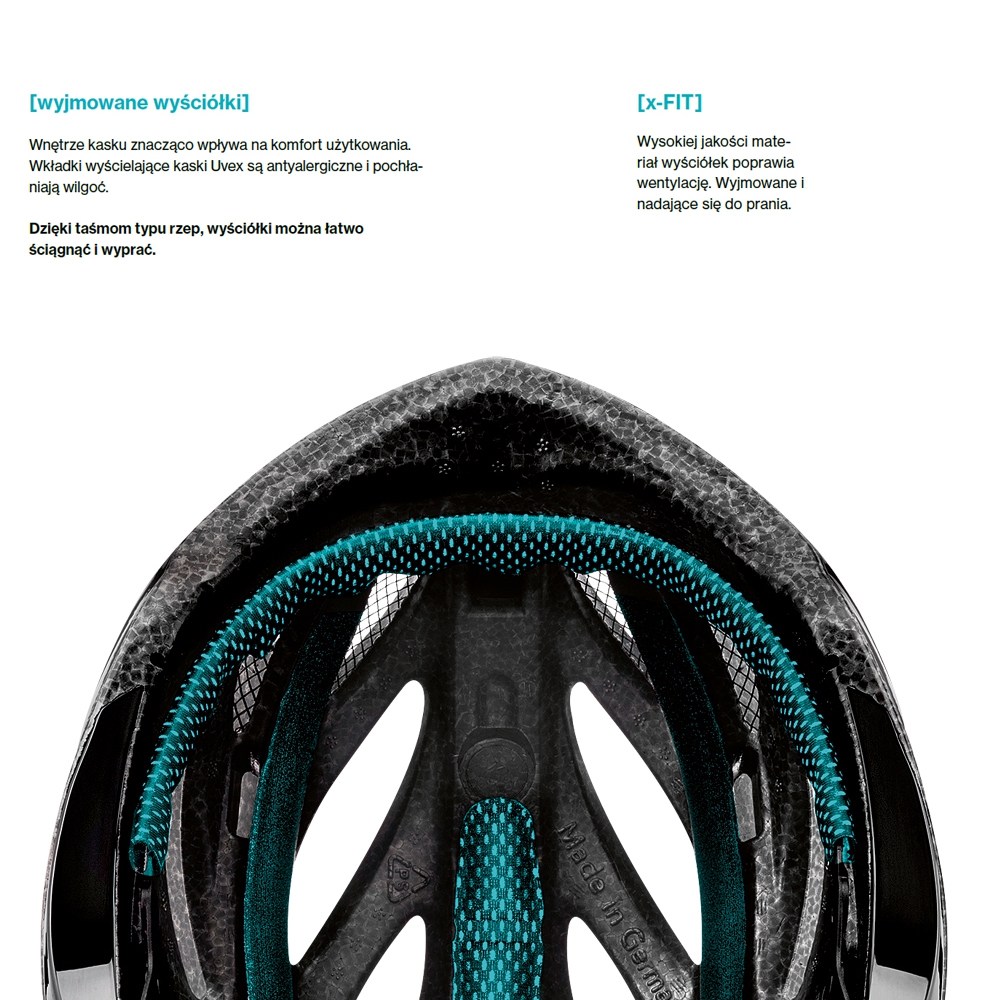 Poza perfekcyjnym dopasowaniem kasku niezwykle ważnym aspektem jest wentylacja. W kaskach Uvex jest ona niewątpliwą zaletą. Kanały wentylacyjne są ułożone w taki sposób aby zachować aerodynamiczny kształt kasku oraz zapewniać komfort i odpowiednią temperaturę wewnątrz kasku. Kask rowerowy Uvex Stride posiada aż 17 otworów wentylacyjnych gwarantujących optymalne dostarczenie świeżego powietrza. Przednie otwory wyposażone są w siatkę ochronną przed owadami. Wnętrze kasku znacząco wpływa na komfort jego użytkowania. Wkładki wyścielające wykonano z wysokiej jakości materiału poprawiającego wentylację. Antybakteryjnie wkładki mocowane na rzep, dzięki czemu można je łatwo wyjąć i wyprać. Wyściółka znajduje się na obwodzie kasku oraz w jego szczycie. Do kasku można dokupić lampkę Uvex Led i zamocować z tyłu kasku.