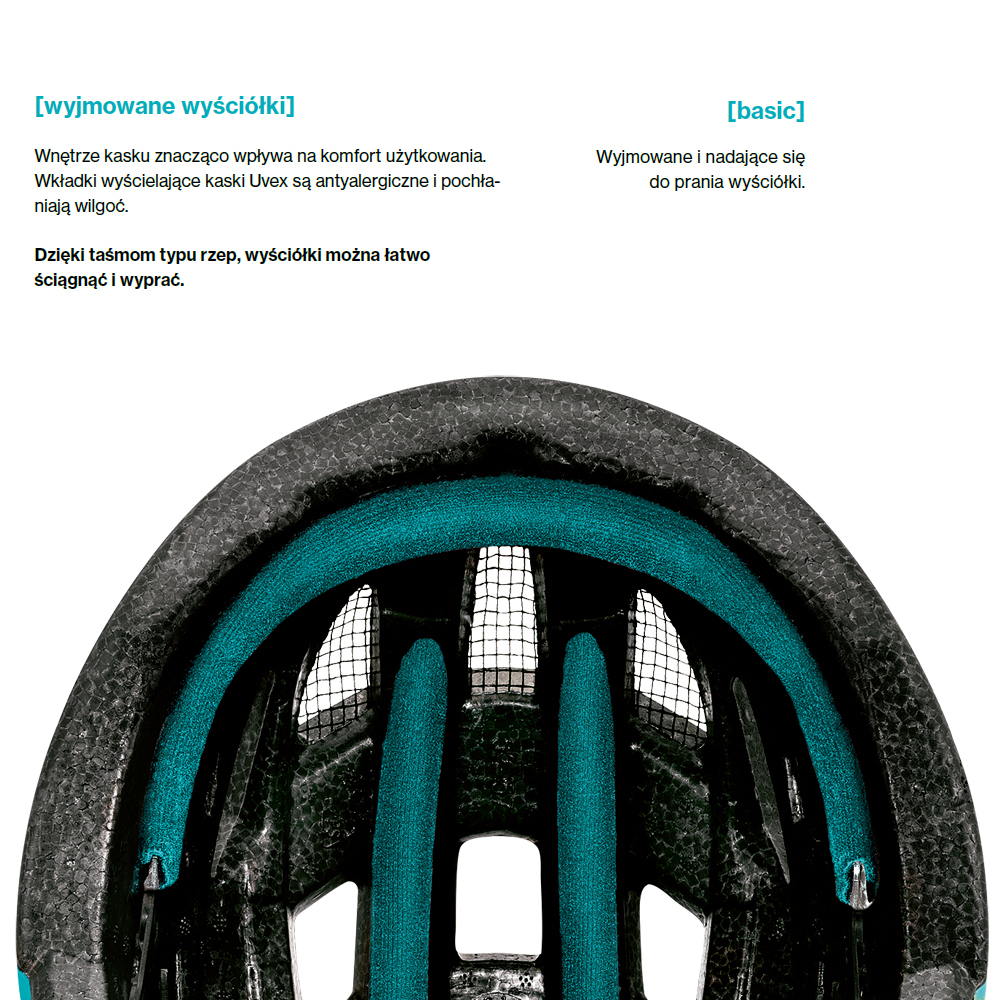 Poza perfekcyjnym dopasowaniem kasku niezwykle ważnym aspektem jest wentylacja. W kaskach Uvex jest ona niewątpliwą zaletą. Kanały wentylacyjne są ułożone w taki sposób aby zachować aerodynamiczny kształt kasku oraz zapewniać komfort i odpowiednią temperaturę wewnątrz kasku. Kask rowerowy Uvex Air Wing 2 posiada aż 25 otworów wentylacyjnych gwarantujące optymalne dostarczenie świeżego powietrza. Przednie otwory wyposażone są w siatkę ochronną przed owadami. Wnętrze kasku znacząco wpływa na komfort jego użytkowania. Wkładki wyścielające wykonano z wysokiej jakości materiału poprawiającego wentylację. Antybakteryjnie wkładki mocowane na rzep, dzięki czemu można je łatwo wyjąć i wyprać. Wyściółka znajduje się na obwodzie kasku oraz w jego szczycie. Kask wyposażony jest w odpinany daszek chroniący przed słońcem. Do kasku można dokupić lampkę Uvex Led i zamocować z tyłu kasku.