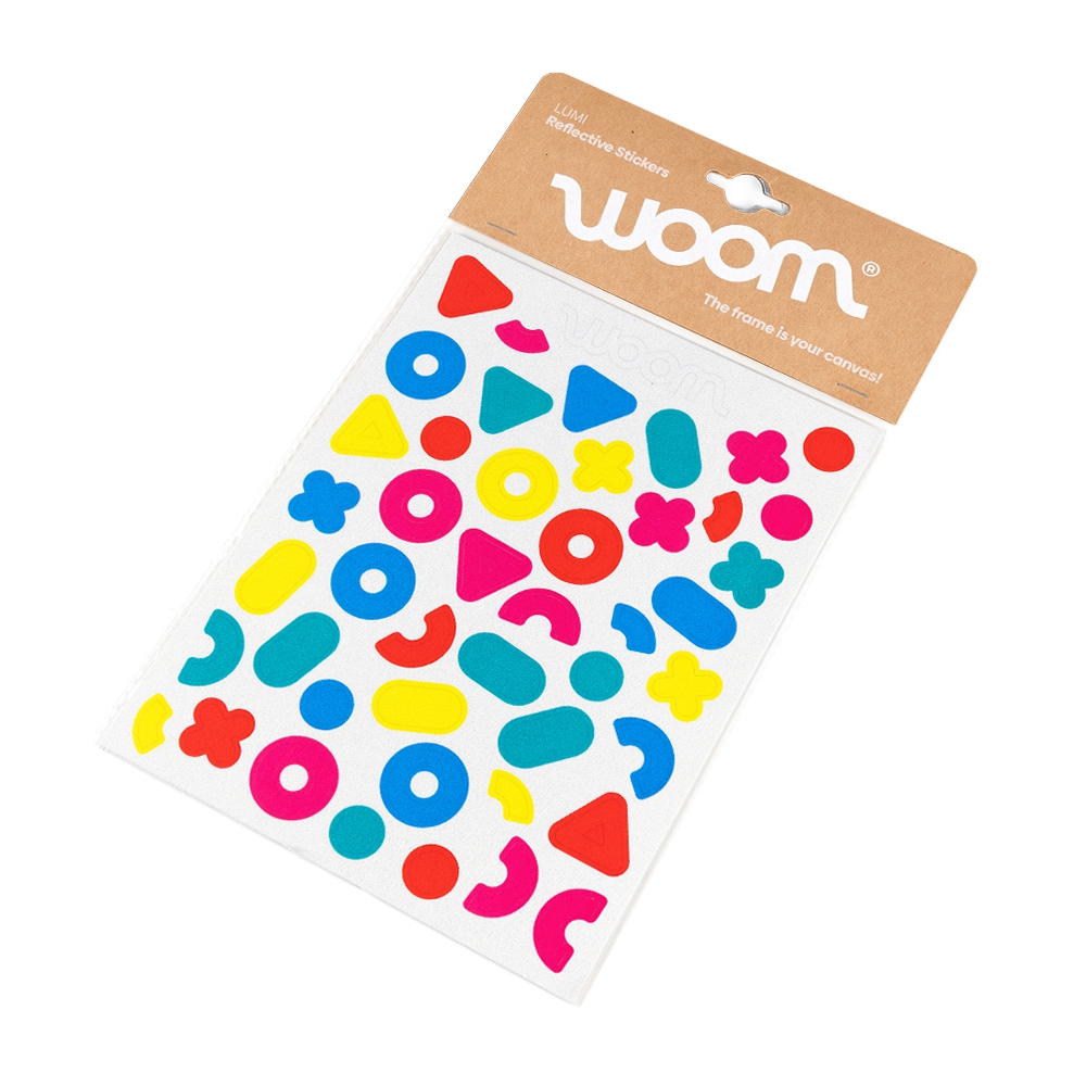 Wysokiej jakości odblaskowe naklejki na ramę roweru, pozwalają dzieciom spersonalizować swój rower woom. Zestaw zawiera dwa arkusze naklejek.