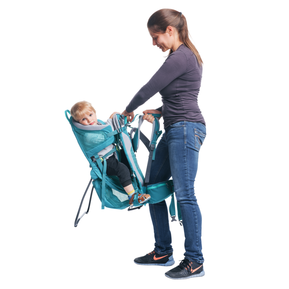 Specyfika nosideł oraz ich funkcja wymagają najwyższego poziomu wygody dla dziecka, ale również dla rodzica co ma istotny wpływ na bezpieczeństwo. Wersja nosidła Deuter Kid Comfort Active SL została zaprojektowana specjalnie dla mam. Odpowiednie wyregulowane pasy biodrowy oraz piersiowy, a także inny, dopasowany do damskiej sylwetki profil szelek zapewnia Paniom większy komfort podczas wspólnych pieszych wycieczek z maluszkiem. Aby nosidło było jak najbardziej uniwersalne i odpowiednie dla wszystkich osób ma ono możliwość regulacji w wielu płaszczyznach. Najważniejsza jest regulacja wysokości położenia szelek oraz ich długości. Umożliwia to system Vari-Quick będący niezwykle prosty w obsłudze, a jednocześnie bardzo skuteczny i wytrzymały. Regulować można też oczywiście długość szelek dopasowując je perfekcyjnie do sylwetki osoby noszącej. Nosidło Deuter Kid Comfort Active posiada także ergonomiczne pasy: na klatce piersiowej oraz pas biodrowy, które zapobiega bujaniu się nosidła zdecydowanie poprawiając jego stabilność. W prawym panelu pasa biodrowego znajduje się kieszonka, w której można schować np. telefon bądź inne drobne przedmioty, które zawsze warto mieć pod ręką. Cały tylni panel nosidła wykonany jest z oddychającego, miękkiego materiału gwarantując najwyższy poziom komfortu dla rodzica. Za utrzymanie stabilności odpowiedzialny jest stelaż wykonany z tworzywa, który jest nie tylko bardzo lekki, a także gwarantuje utrzymanie prawidłowej pozycji dziecka. Dolna część stelaża jest regulowana i może służyć jako nóżka dając możliwość stabilnego położenia nosidła na gruncie podczas odpoczynku.