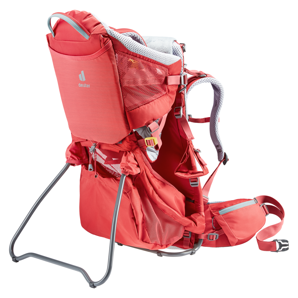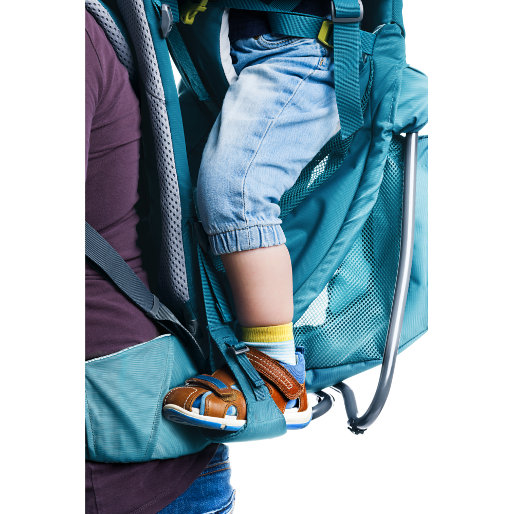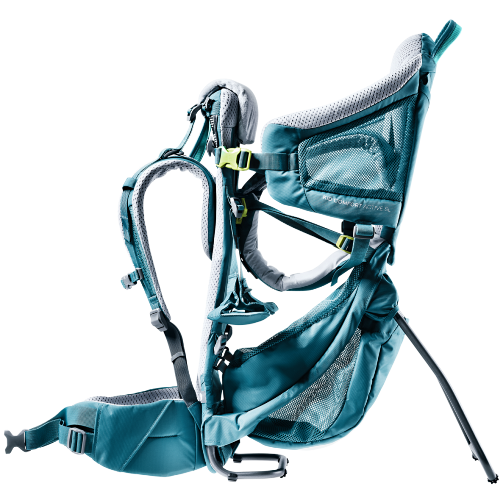 Nosidło Deuter Kid Comfort Active SL to bardzo uniwersalny i praktyczny produkt, który zapewnia najwyższy poziom komfortu oraz bezpieczeństwa dla dziecka, a także dla rodzica podczas wycieczek. Nosidło wykonane zostało z wysokiej jakości poliestru 210D dzięki czemu jest bardzo lekkie, a także wytrzymałe. Jest to tkanina odpowiednio miękka dbając o komfort malucha i niwelując ryzyko otarć u rodzica. Całe nosidło Deuter Kid Comfort Active SL waży jedynie 2,68 kg czyniąc je jednym z najlżejszych nosideł dostępnych na rynku. Maksymalne obciążenie fotelika nosidła to 22 kg, a dla bagażnika limit ten to 2 kg. Sam fotelik posiada odpowiednio rozmieszczone miękkie wkładki, które zapewniają bezpieczną i wygodą pozycję dziecka w każdych warunkach. Najwięcej takich wkładek znajduje się na oparciu fotelika. Są one wykonane z odpowiednio dopasowującego się do dziecięcej sylwetki materiału, który posiada drobne otwory wentylacyjne dzięki czemu plecki dziecka są odpowiednio wentylowane równocześnie zmniejszając wagę nosidła. Miękkie pasy bezpieczeństwa mają możliwość regulacji ich długości oraz wysokości czyniąc nosidło jeszcze bardziej uniwersalnym. Boczne panele fotelika wykonane są z wytrzymałej siateczki dbając o odpowiednią cyrkulację powietrza. Klamra znajdująca się na panelu umożliwia szybkie i bezpieczne umieszczenie dziecka w foteliku. Na przedzie fotelika znajduje się miękka poduszeczka, którą można z łatwością wypiąć i uprać. Pod poduszeczką znajduje się pas, który reguluje głębokość fotelika oraz jego położenie. Nosidło Deuter Kid Comfort posiada także wygodne podnóżki, które mają możliwość ustawienia odpowiedniej wysokości.