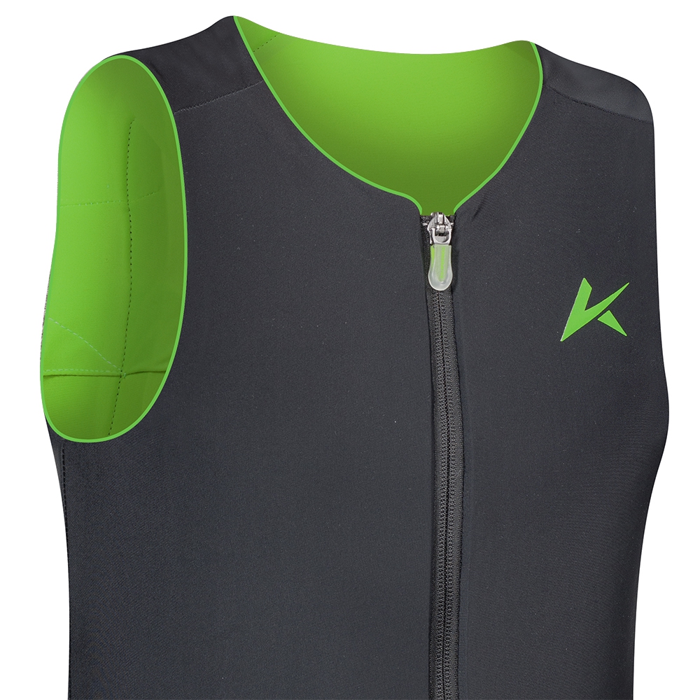 Kamizelka ochronna Komperdell Ballistic FlexFit Pro Junior to całkowita nowość wśród ochraniaczy narciarskich dla juniorów nazywanych żółwiami. Austriacka marka specjalizująca się w produkcji profesjonalnych ochraniaczy do wszelkiego rodzaju aktywności przedstawia juniorską kamizelkę ochronną z systemem 360°, która chroni nie tylko plecy, a cały tułów dziecka. Podstawę kamizelki stanowi nowoczesny Cross 8.0. Zbudowany jest z zaawansowanego, wielowarstwowego materiału elastomerowego o różnej gęstości. Ten zaawansowany protektor pochałania ponad 85% siły uderzenia gwarantując najlepszą ochronę tułowia, a w szczególności kręgosłupa gdzie materiał ma jeszcze więcej warstw. Ochraniacz Cross 8.0 w neutralnych warunkach jest elastyczny i doskonale adaptuje się do sylwetki młodego narciarza gwarantując pełną swobodę ruchów natomiast podczas uderzenia materiał sztywnieje niezwykle skutecznie chroniąc klatkę piersiową, brzuch, żebra, a także plecy młodego narciarza przed obrażeniami. Jest to kolejna odsłona protektorów Cross opatentowanych przez Komperdell. Nowa wersja Cross 8.0 jest lżejsza i bardziej elastyczna niż poprzednie, co oznacza większy komfort noszenia i jeszcze lepszą swobodę ruchów, przy zachowaniu tego samego wysokiego poziomu ochrony.