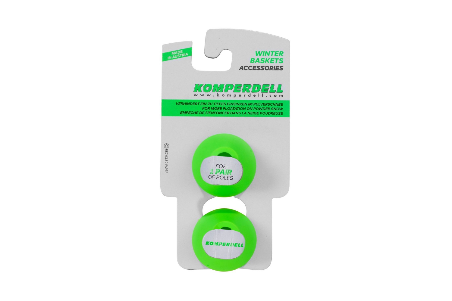 Komperdell Downhill Race Basket to zawodnicze talerzyki narciarskie o średnicy 38 mm, przeznaczone do gigantowych i zjazdowych modeli kijów Komperdell, w tym kijów z linii Nationalteam. Ich charakterystyczny, dzwonkowaty kształt został opracowany z myślą o jeździe z bardzo dużą prędkością – pozwala kijowi płynnie wchodzić i wychodzić ze śniegu, zmniejszając opór i poprawiając aerodynamikę ruchu. Taka konstrukcja ma także praktyczne znaczenie podczas przejazdów między tyczkami, ponieważ ogranicza ryzyko zahaczenia talerzykiem o tyczkę już po jej minięciu. Niewielka średnica zapewnia precyzyjne podparcie na twardej, przygotowanej trasie, co jest szczególnie ważne w konkurencjach szybkościowych, takich jak gigant czy zjazd. Solidna konstrukcja gwarantuje trwałość i niezawodne działanie nawet podczas bardzo intensywnej jazdy.