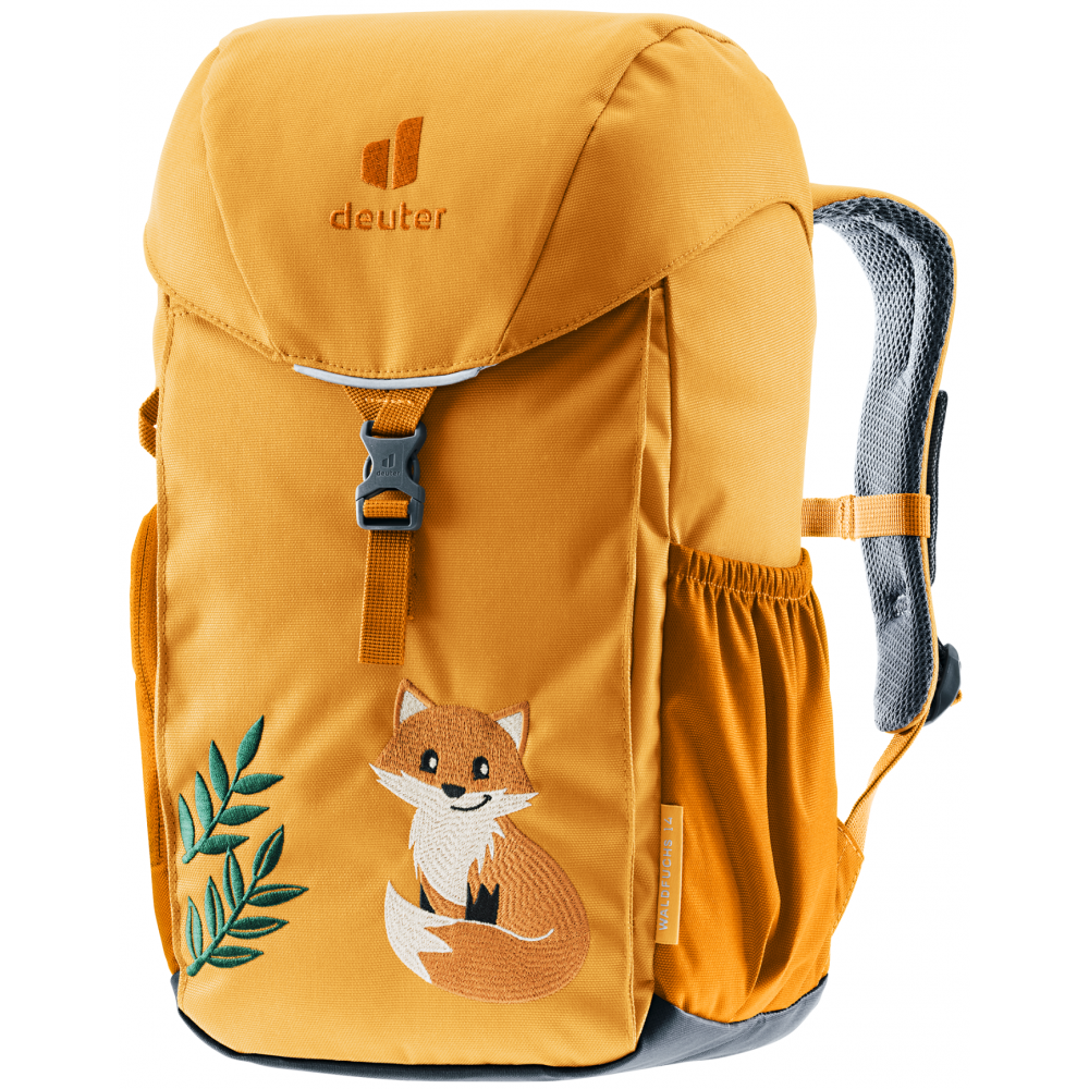 Deuter Waldfuchs 14 to plecak stworzony z myślą o przedszkolakach i dzieciach uczęszczających do przedszkoli i szkół. Wykonany jest w 100% z materiału pochodzącego z recyklingu, a wszystkie jego elementy są przyjazne dla środowiska. Plecak ma twardą, odporną na przetarcia konstrukcję i zapewnia dużo miejsca na wszystkie dziecięce rzeczy. Ergonomiczny, wyściełany tylni panel i odpowiednie rozłożenie ciężaru sprawiają, że maluchy mogą nosić go wygodnie, nawet podczas biegania i zabawy. Plecak wyposażono w miękkie, ergonomiczne szelki oraz regulowany pas piersiowy, które dopasowują się do małego ciała użytkownika. Dobre przewietrzanie pleców zapobiega nadmiernemu poceniu podczas ruchu. Waldfuchs 14 ma liczne kieszenie: główną zamykaną na sznurek i klapę, przednią na drobiazgi oraz boczne elastyczne kieszonki. Dodatkowo znajdziemy tu odpinaną matę do siedzenia, wewnętrzny identyfikator, przegrodkę na mokre rzeczy, uchwyty do przyczepienia drobiazgów oraz odblaskowe elementy zwiększające bezpieczeństwo. Plecak Deuter Waldfuchs 14 ma też zdejmowaną pokrowiec przeciwdeszczowy i wodoodporne dno.