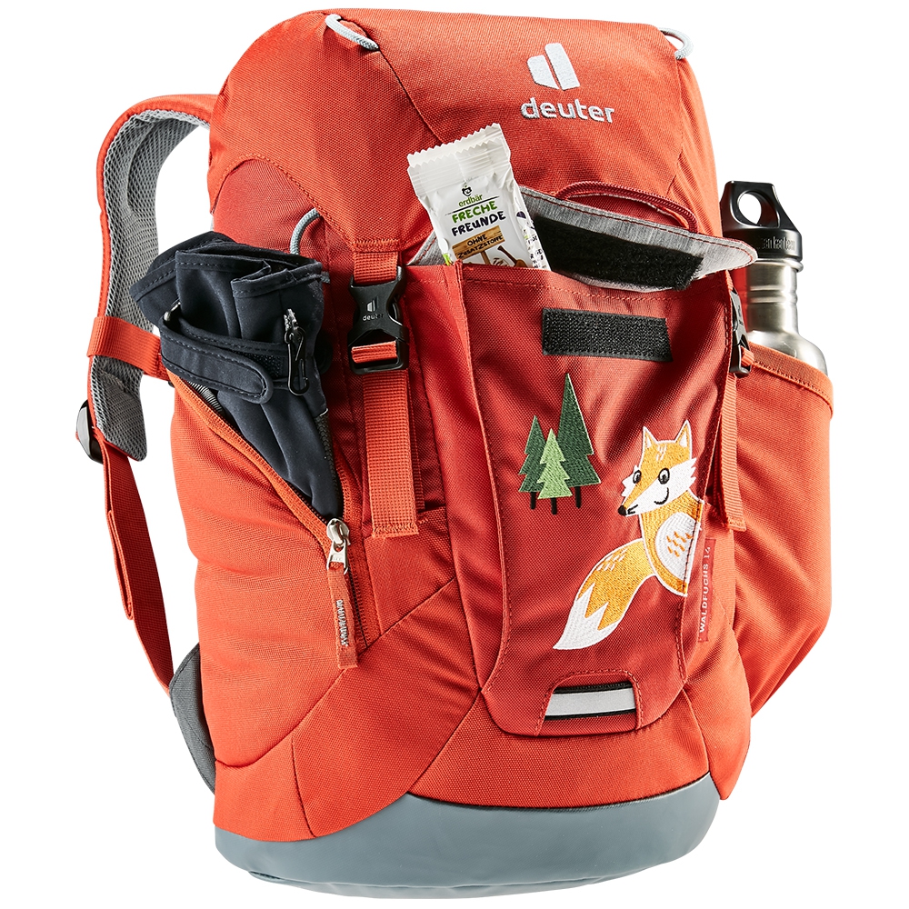 Deuter Waldfuchs 14 to plecak stworzony z myślą o przedszkolakach i dzieciach uczęszczających do przedszkoli i szkół. Wykonany jest w 100% z materiału pochodzącego z recyklingu, a wszystkie jego elementy są przyjazne dla środowiska. Plecak ma twardą, odporną na przetarcia konstrukcję i zapewnia dużo miejsca na wszystkie dziecięce rzeczy. Ergonomiczny, wyściełany tylni panel i odpowiednie rozłożenie ciężaru sprawiają, że maluchy mogą nosić go wygodnie, nawet podczas biegania i zabawy. Plecak wyposażono w miękkie, ergonomiczne szelki oraz regulowany pas piersiowy, które dopasowują się do małego ciała użytkownika. Dobre przewietrzanie pleców zapobiega nadmiernemu poceniu podczas ruchu. Waldfuchs 14 ma liczne kieszenie: główną zamykaną na sznurek i klapę, przednią na drobiazgi oraz boczne elastyczne kieszonki. Dodatkowo znajdziemy tu odpinaną matę do siedzenia, wewnętrzny identyfikator, przegrodkę na mokre rzeczy, uchwyty do przyczepienia drobiazgów oraz odblaskowe elementy zwiększające bezpieczeństwo. Plecak Deuter Waldfuchs 14 ma też zdejmowaną pokrowiec przeciwdeszczowy i wodoodporne dno.