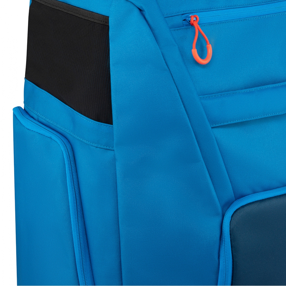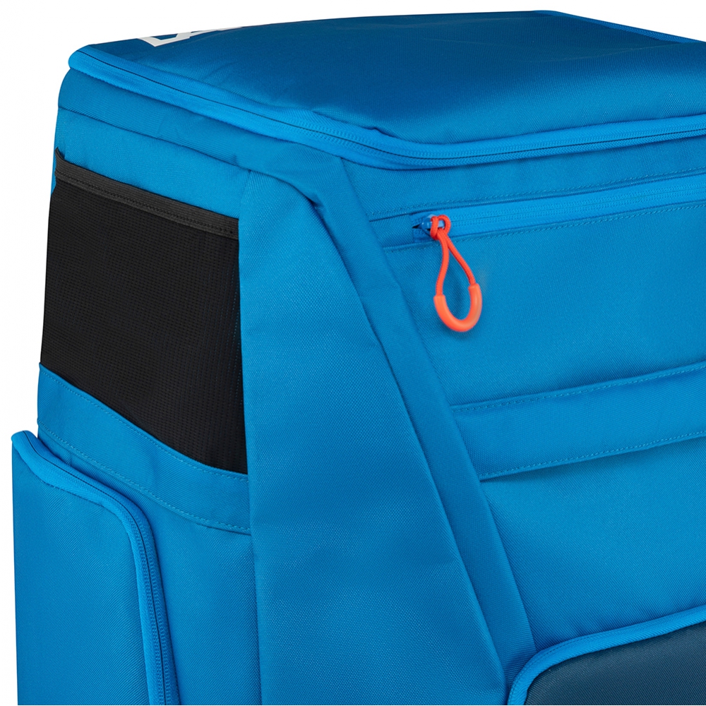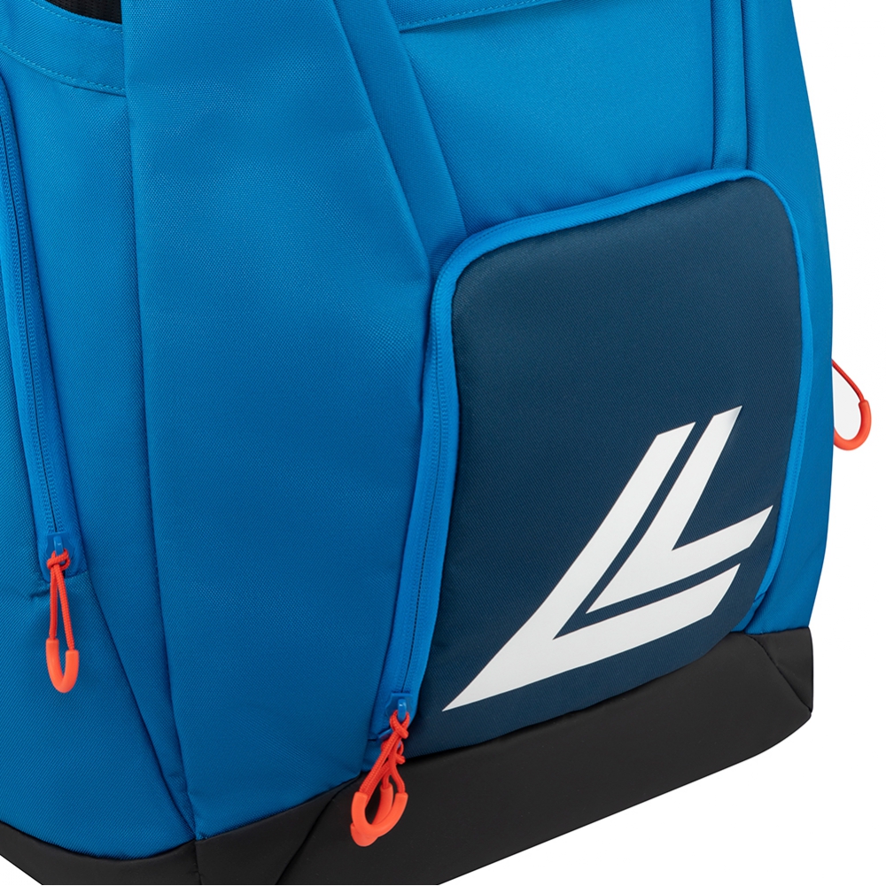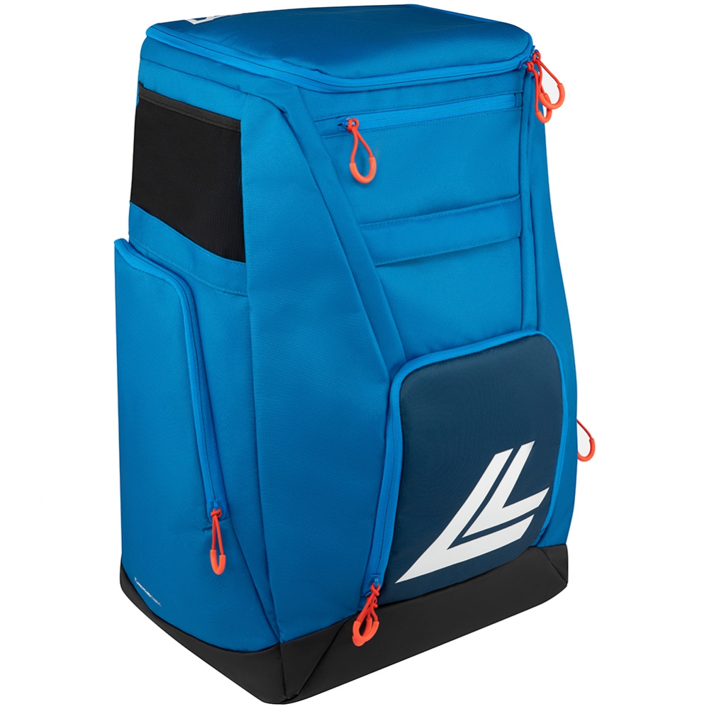 Plecak narciarski Lange Racer Bag Small umożliwia wygodne spakowanie sprzętu narciarskiego, odzieży oraz akcesoriów minimalizując ryzyko ich przemoczenia bądź zarysowania. Plecak posiada jedną główną dużą komorę, do której można schować sprzęt narciarski lub ubrania. Otwierana jest ona od góry umożliwiając uporządkowanie ekwipunku. W klapie komory znajduje się pojemna kieszeń, która przeznaczona jest na kask narciarski. Producent pomyślał również o najbardziej delikatnym elemencie sprzętu narciarskiego jakim są gogle, a w szczególności ich szybka i przeznaczył na nią miękko wyłożoną mikropolarem kieszeń we frontowej części plecaka. Buty narciarskie umieszczane są w kieszeniach bocznych plecaka, które są wyłożone nieprzemakalnym brezentem. Zabezpiecza to przemoczenie odzieży znajdującej się w głównej komorze śniegiem oraz wodą znajdującym się na butach. kieszenie pozwalają na schowanie drobnych rzeczy jak klucze czy dokumenty. W plecaku można zmieścić sporo rzeczy, jego pojemność to aż 75 litrów. Wymiary plecaka to 60 x 36 x 38 cm. Niebieski kolor plecaka narciarskiego doskonale komponuje się z nartami Dynastar czy butami Lange dedykowanymi dla zawodników.