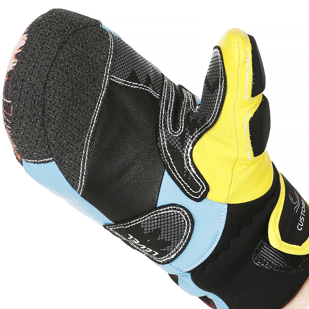 Rękawice narciarskie Level Worldcup JR CF Mitten wykonane z niesamowitą precyzją, przy użyciu najwyższej klasy materiałów rękawice przeznaczone dla młodzieży do sportowej jazdy na tyczkach. Są niezwykle wytrzymałe, ciepłe, a przy tym chronią dłonie przed odbijającymi bramkami i przetarciami od kijków. Niemal cała warstwa zewnętrzna rękawic Level Worldcup JR CF uszyta została z najwyższej jakości koziej skóry. Jest to materiał, który wyróżnia niezwykła wytrzymałość, dobra elastyczność, a także niska waga dzięki czemu rękawica idealnie dopasowuje się do rękojeści kija narciarskiego oraz do dłoni narciarza. Po wewnętrznej stronie rękawic w miejscach chwytu kija narciarskiego znajdziemy skórzane naszywki wzmacniające te najbardziej narażone na przetarcia i uszkodzenia mechaniczne miejsca. Chcąc poprawić chwyt na naszywkach nadrukowano również warstwę silikonu.