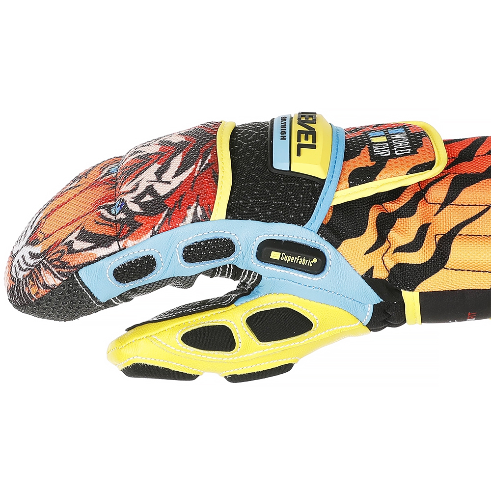 Wykonanie rękawic Level Worldcup JR CF, ich profil i rozbudowany system protektorów. Na knykciach oraz palcach umieszczono solidne protektory z tworzywa chroniące newralgiczne miejsca dłoni. Wierzchnia strona rękawic została wykonana z niezawodnego materiału SuperFabric. Jest to niezwykle wytrzymały na wszelkie uszkodzenia mechaniczne materiał przez co doskonale sprawdza się we wszelkich ochraniaczach do sportów ekstremalnych. Protektory znajdują się również na zewnętrznej części kciuka. Mankiety zapinane na odpowiednio szerokie, wytrzymałe rzepy zapobiegają osuwaniu się rękawic.