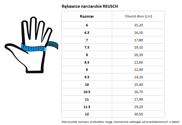 Rozmiar rękawic zestawione z obwodem dłoni mierzonych w najszerszym miejscu: