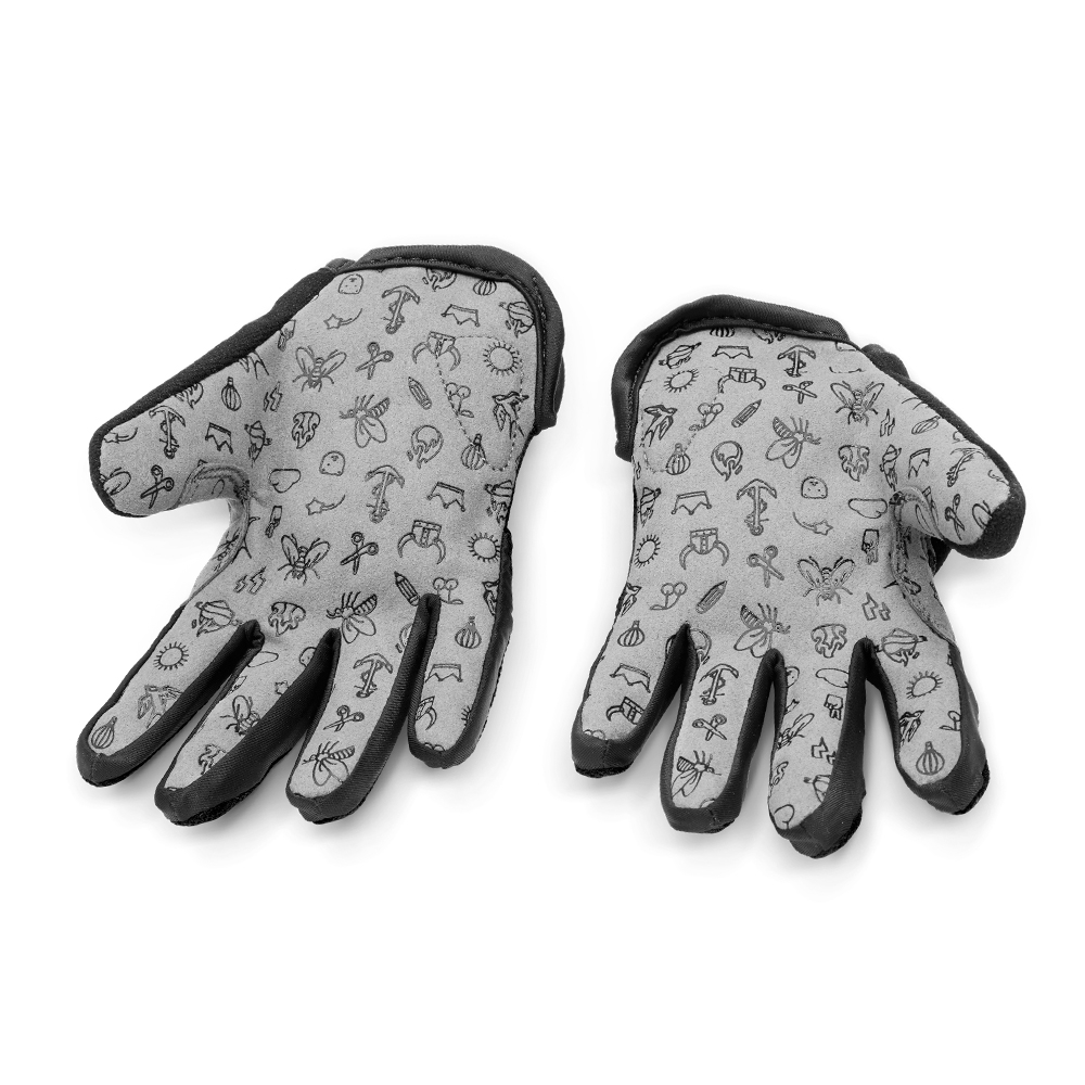 - Dla zwiększenia przyczepności oraz zapobiegania ześlizgnięciu się dłoni z kierownicy spód rękawiczek wykończono silikonową warstwą z motywami lodów i cukierków, czyli tym, co dzieciaki lubią najbardziej