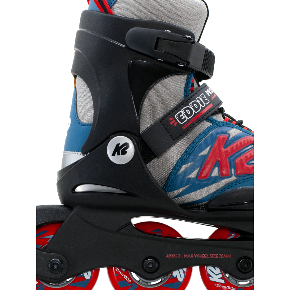 Seria rolek K2 Eddie Pro przeznaczona jest dla dzieci i młodzieży. Idealna dla dzieciaków zaczynających naukę jazdy na rolkach, jak również do późniejszej jazdy rekreacyjnej. Regulowany but umożliwia dopasowanie rolek do rosnącej stopy dziecka, dzięki czemu z rolek można korzystać przez kilka sezonów. System regulacji obejmuje aż 5 rozmiarów i obsługiwany jest za pomocą wygodnego przycisku. Mechanizm jest prosty w użyciu dla rodzica, a jednocześnie zabezpieczony przed przypadkową zmianą podczas jazdy. Takie rozwiązanie pozwala ograniczyć konieczność częstej wymiany sprzętu i zapewnia długotrwałe użytkowanie.