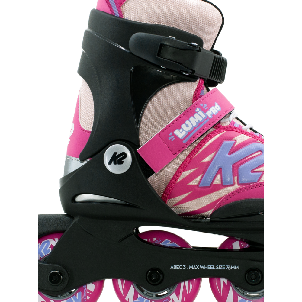 Seria rolek K2 Lumi Pro przeznaczona jest dla dzieci i młodzieży. Idealna dla dzieciaków zaczynających naukę jazdy na rolkach, jak również do późniejszej jazdy rekreacyjnej. Regulowany but umożliwia dopasowanie rolek do rosnącej stopy dziecka, dzięki czemu z rolek można korzystać przez kilka sezonów. System regulacji obejmuje aż 5 rozmiarów i obsługiwany jest za pomocą wygodnego przycisku. Mechanizm jest prosty w użyciu dla rodzica, a jednocześnie zabezpieczony przed przypadkową zmianą podczas jazdy. Takie rozwiązanie pozwala ograniczyć konieczność częstej wymiany sprzętu i zapewnia długotrwałe użytkowanie.