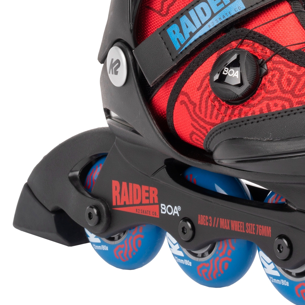 W rolkach K2 Raider BOA zastosowano kompozytowe, zintegrowane płozy rekreacyjne K2 F.B.I (Frame Base Integration). Posiadają one obniżony środek ciężkości, świetnie amortyzują wstrząsy i wibracje, a także ułatwiają zachowanie równowagi na rolkach. Ten rodzaj płóz stosowany jest przez K2 w rolkach dla dzieci, początkujących rolkarzy lub na trudniejsze nawierzchnie. Hamulec tylny, znajduje się w prawej rolce.