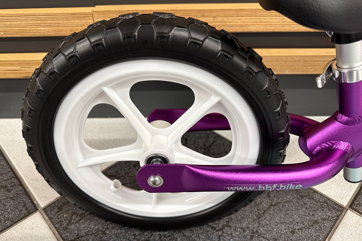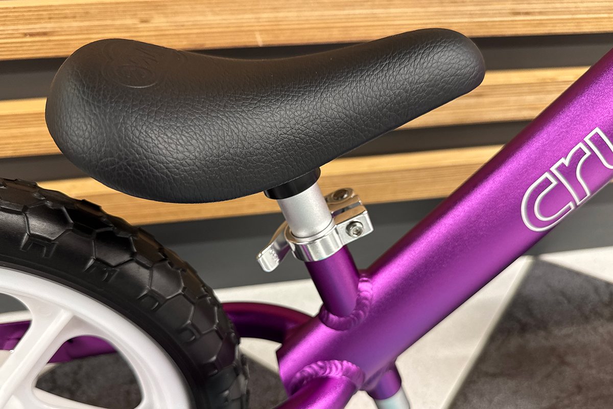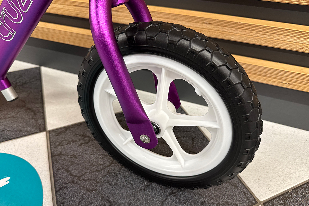 Rowerek Cruzee wyposażony jest w 12 calowe koła. Miękkie, piankowe opony świetnie sprawdzają się zarówno w domu jak i na zewnątrz. Zapewniają komfortową i cichą jazdę, są bezobsługowe, tzn. nie ma ryzyka przebicia ani potrzeby pompowania. Szczelne łożyska maszynowe w kołach zapewniają długi i bezawaryjny okres użytkowania. Siodełko rowerka biegowego Cruzee o ergonomicznym kształcie zapewnia stabilną i komfortową pozycję dziecka na rowerku oraz wspiera ruchy biegowe dziecka.