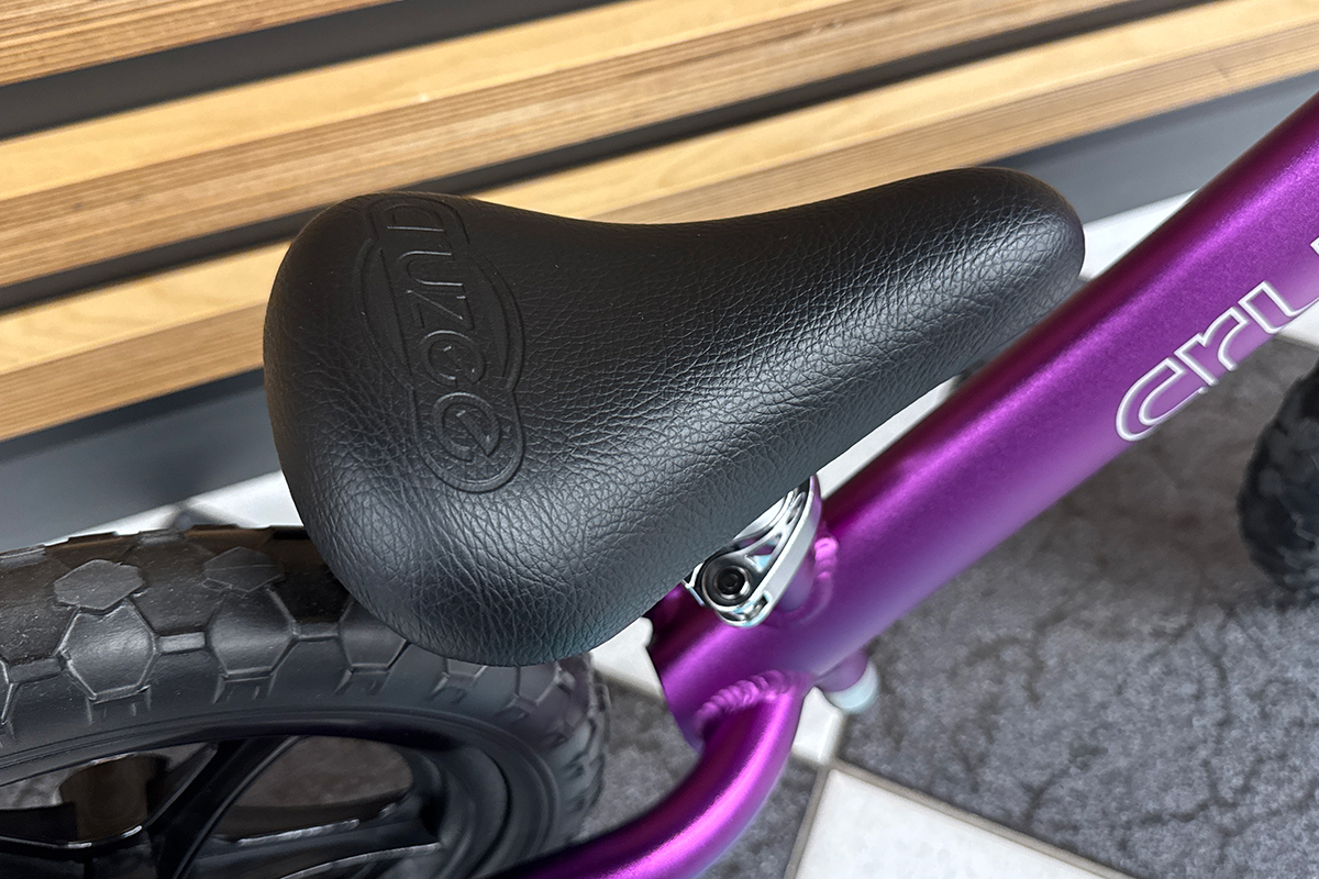 Rowerek Cruzee wyposażony jest w 12 calowe koła. Miękkie, piankowe opony świetnie sprawdzają się zarówno w domu jak i na zewnątrz. Zapewniają komfortową i cichą jazdę, są bezobsługowe, tzn. nie ma ryzyka przebicia ani potrzeby pompowania. Szczelne łożyska maszynowe w kołach zapewniają długi i bezawaryjny okres użytkowania. Siodełko rowerka biegowego Cruzee o ergonomicznym kształcie zapewnia stabilną i komfortową pozycję dziecka na rowerku oraz wspiera ruchy biegowe dziecka.