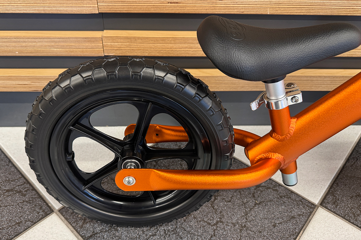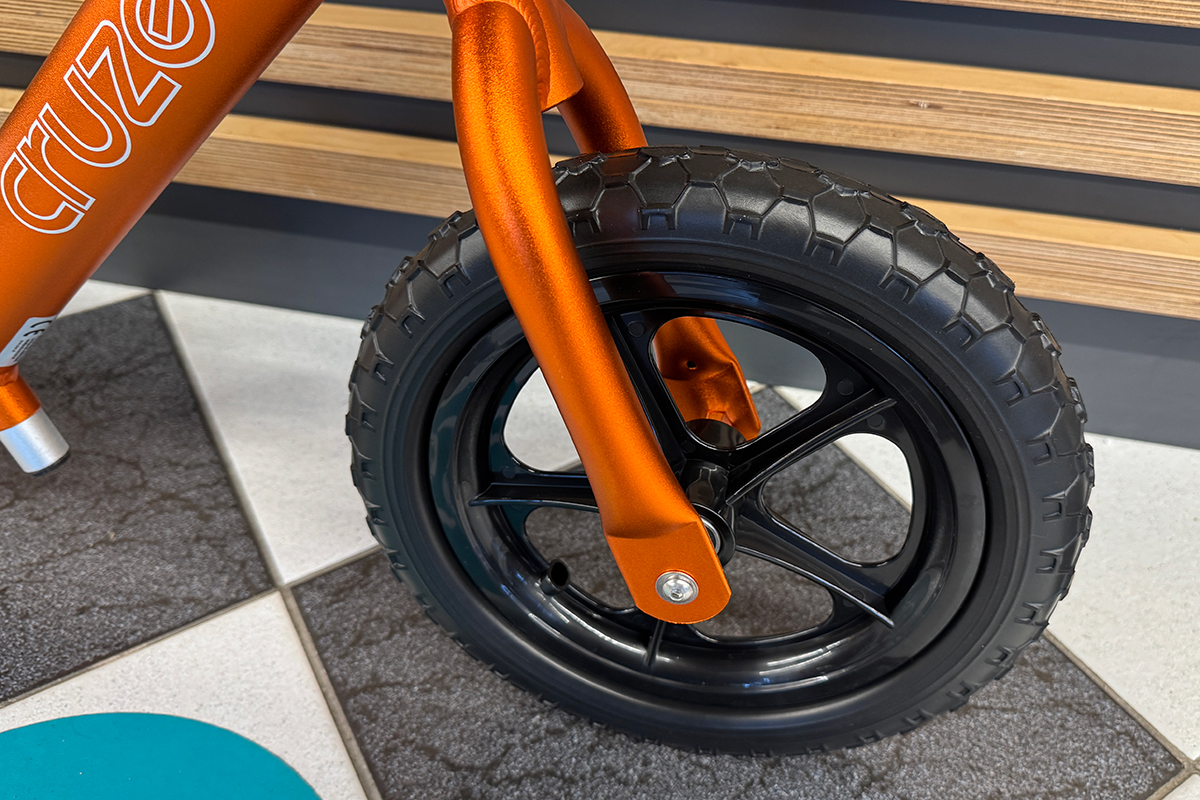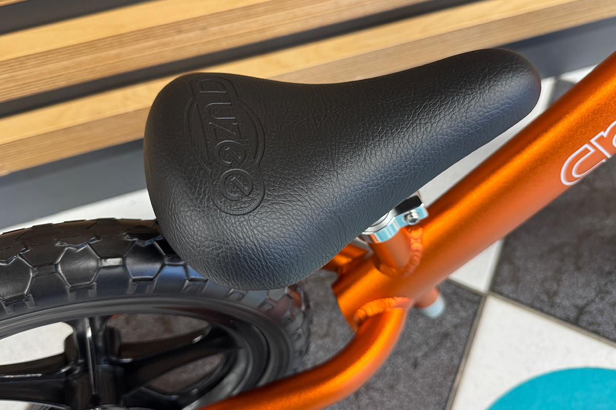 Rowerek Cruzee wyposażony jest w 12 calowe koła. Miękkie, piankowe opony świetnie sprawdzają się zarówno w domu jak i na zewnątrz. Zapewniają komfortową i cichą jazdę, są bezobsługowe, tzn. nie ma ryzyka przebicia ani potrzeby pompowania. Szczelne łożyska maszynowe w kołach zapewniają długi i bezawaryjny okres użytkowania. Siodełko rowerka biegowego Cruzee o ergonomicznym kształcie zapewnia stabilną i komfortową pozycję dziecka na rowerku oraz wspiera ruchy biegowe dziecka.