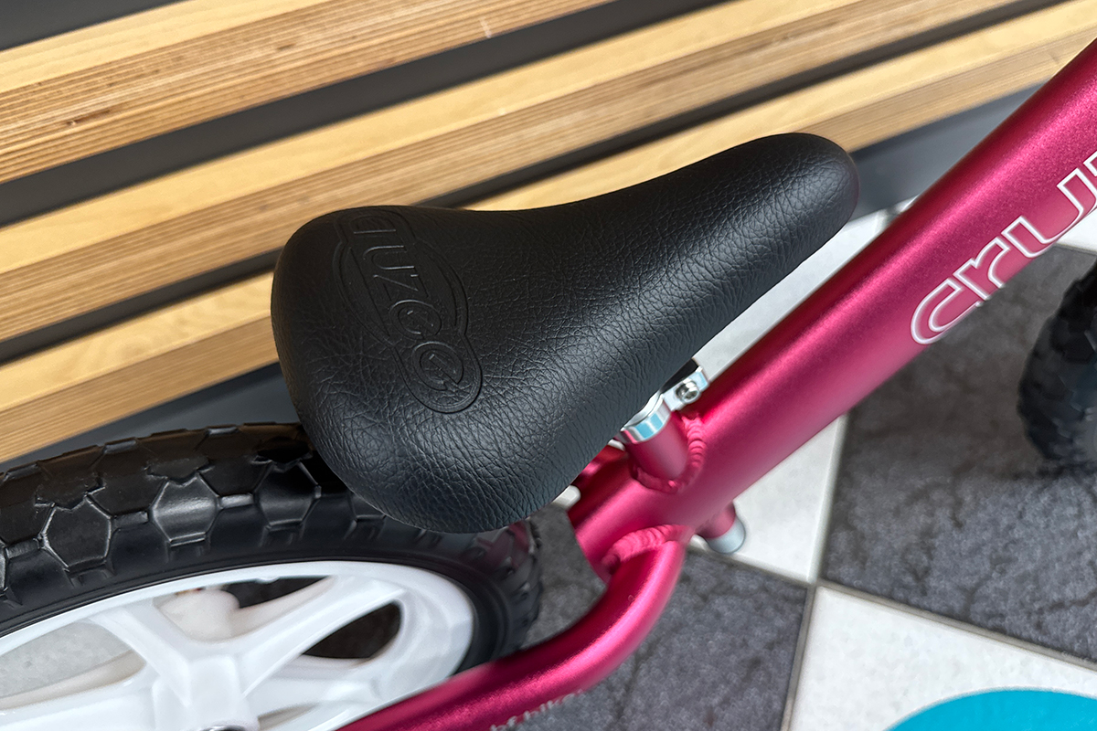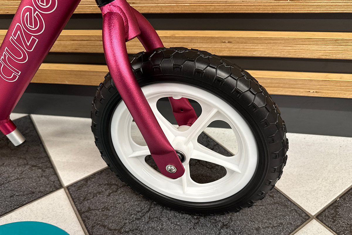 Rowerek Cruzee wyposażony jest w 12 calowe koła. Miękkie, piankowe opony świetnie sprawdzają się zarówno w domu jak i na zewnątrz. Zapewniają komfortową i cichą jazdę, są bezobsługowe, tzn. nie ma ryzyka przebicia ani potrzeby pompowania. Szczelne łożyska maszynowe w kołach zapewniają długi i bezawaryjny okres użytkowania. Siodełko rowerka biegowego Cruzee o ergonomicznym kształcie zapewnia stabilną i komfortową pozycję dziecka na rowerku oraz wspiera ruchy biegowe dziecka.