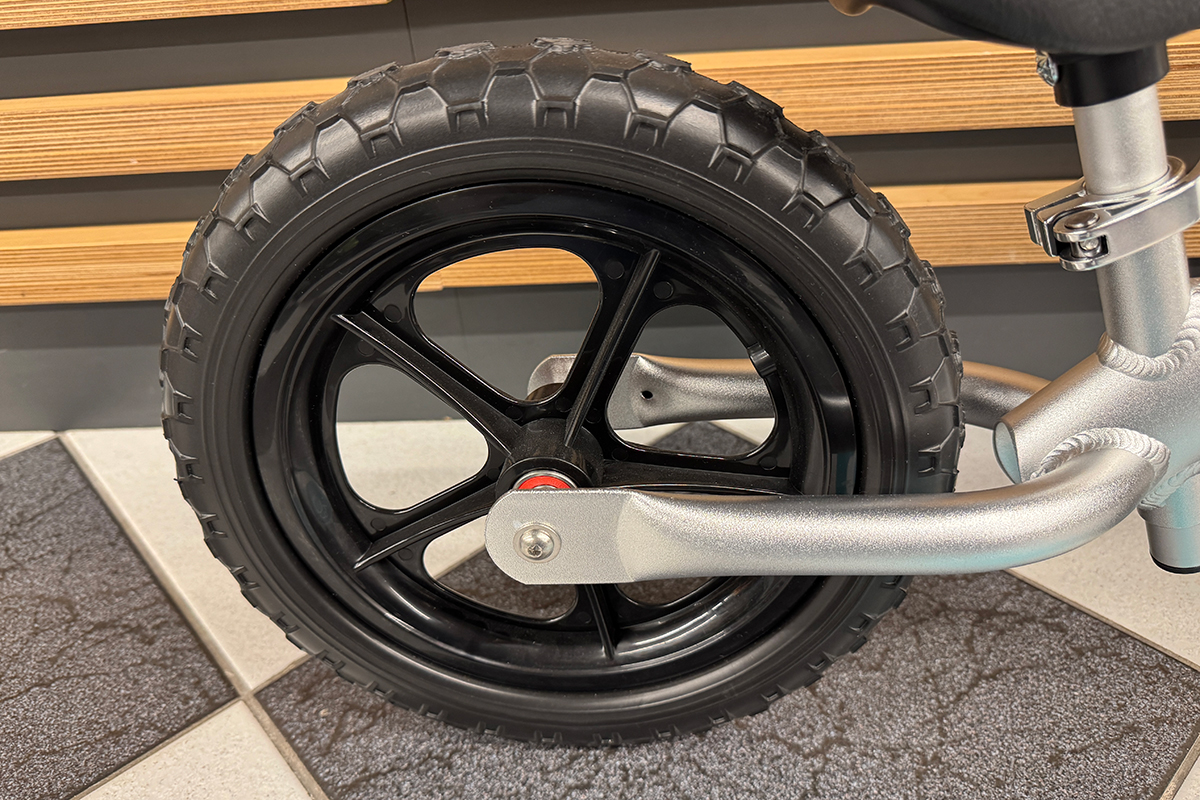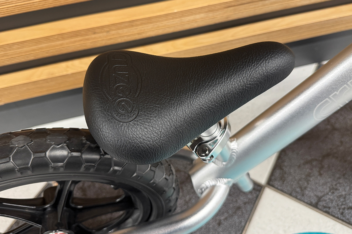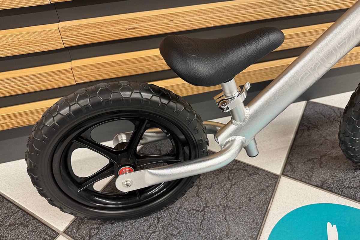 Rowerek Cruzee wyposażony jest w 12 calowe koła. Miękkie, piankowe opony świetnie sprawdzają się zarówno w domu jak i na zewnątrz. Zapewniają komfortową i cichą jazdę, są bezobsługowe, tzn. nie ma ryzyka przebicia ani potrzeby pompowania. Szczelne łożyska maszynowe w kołach zapewniają długi i bezawaryjny okres użytkowania. Siodełko rowerka biegowego Cruzee o ergonomicznym kształcie zapewnia stabilną i komfortową pozycję dziecka na rowerku oraz wspiera ruchy biegowe dziecka.