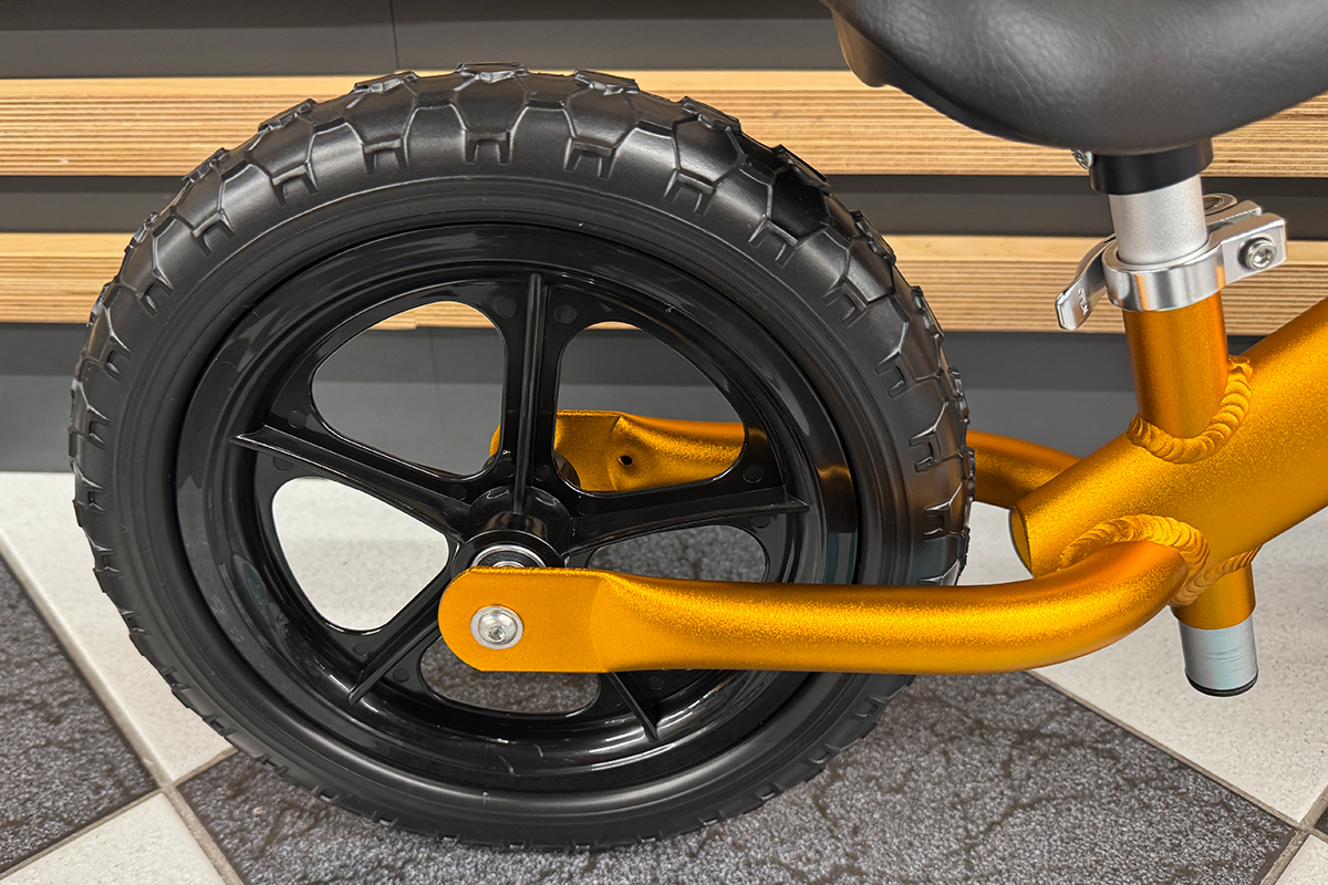 Rowerek Cruzee wyposażony jest w 12 calowe koła. Miękkie, piankowe opony świetnie sprawdzają się zarówno w domu jak i na zewnątrz. Zapewniają komfortową i cichą jazdę, są bezobsługowe, tzn. nie ma ryzyka przebicia ani potrzeby pompowania. Szczelne łożyska maszynowe w kołach zapewniają długi i bezawaryjny okres użytkowania. Siodełko rowerka biegowego Cruzee o ergonomicznym kształcie zapewnia stabilną i komfortową pozycję dziecka na rowerku oraz wspiera ruchy biegowe dziecka.