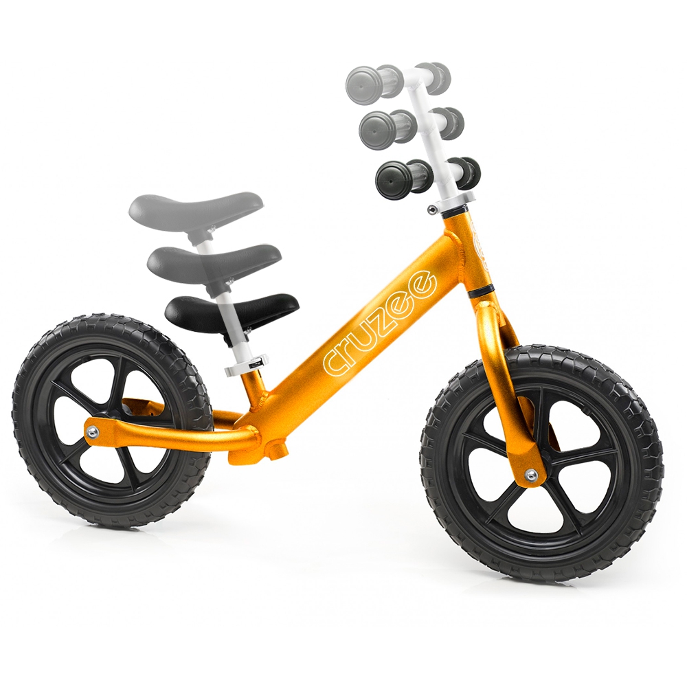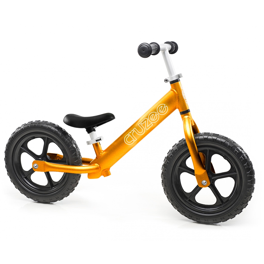 Złoty rowerek biegowy Cruzee 12 to najlżejszy model w naszej ofercie. Zalecany dla dzieci w wieku od 2 lat (często nawet od 18 miesięcy). Rower posiada regulację wysokości siodełka od 30 do 40 cm, a po zmianie sztycy (druga, dłuższa jest w komplecie) od 40 do 50 cm. Kierownica regulowana od 50 do 60 cm. Regulacje odbywają się bez potrzeby użycia klucza, dzięki szybkozamykaczom. Złote anodowane aluminium zapewnia bardzo atrakcyjną kolorystykę rowerka Cruzee.