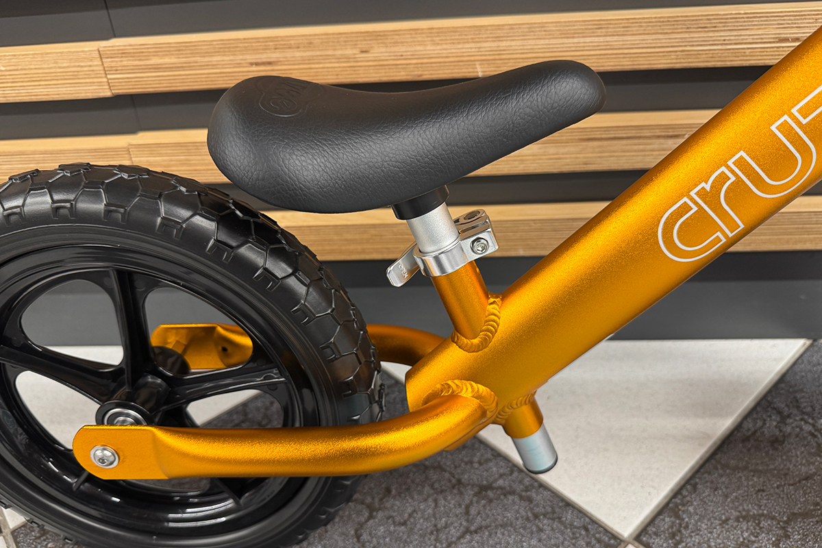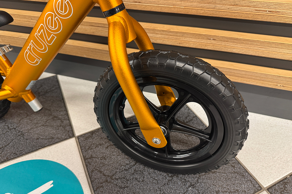 Rowerek Cruzee wyposażony jest w 12 calowe koła. Miękkie, piankowe opony świetnie sprawdzają się zarówno w domu jak i na zewnątrz. Zapewniają komfortową i cichą jazdę, są bezobsługowe, tzn. nie ma ryzyka przebicia ani potrzeby pompowania. Szczelne łożyska maszynowe w kołach zapewniają długi i bezawaryjny okres użytkowania. Siodełko rowerka biegowego Cruzee o ergonomicznym kształcie zapewnia stabilną i komfortową pozycję dziecka na rowerku oraz wspiera ruchy biegowe dziecka.