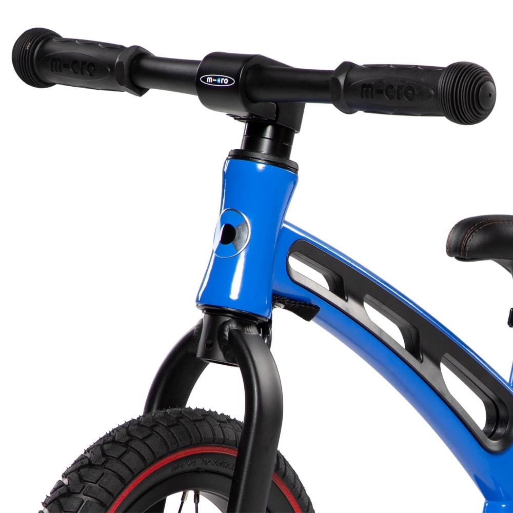 Rowerek biegowy Micro Balance Bike skonstruowany jest tak, aby utrzymanie równowagi, a także sama jazda były jak najbardziej bezpieczne. Nisko prowadzona rama ułatwia wsiadanie oraz zsiadanie, a także obniża środek ciężkości ułatwiając utrzymanie równowagi dziecku. Kierownica rowerka balansowego Micro Balance Bike Deluxe osadzona jest na mostku AHEAD, który utrzymuje ją na stałym poziomie wspierając prawidłową sylwetkę dziecka podczas jazdy na rowerku. Ponadto kierownica ma możliwość regulacji od 52 do 55 cm. Wyprofilowane gumowe uchwyty czynią chwyt pewnym, a poszerzenia na ich końcach zapobiegają zsuwaniu się dziecięcych dłoni podczas jazdy. Praktycznym rozwiązaniem jest uchwyt znajdujący się na tyle siodełka, który ułatwia jego transport, a przede wszystkim ułatwia asekurację przez opiekuna podczas pierwszych kroków na biegówce.