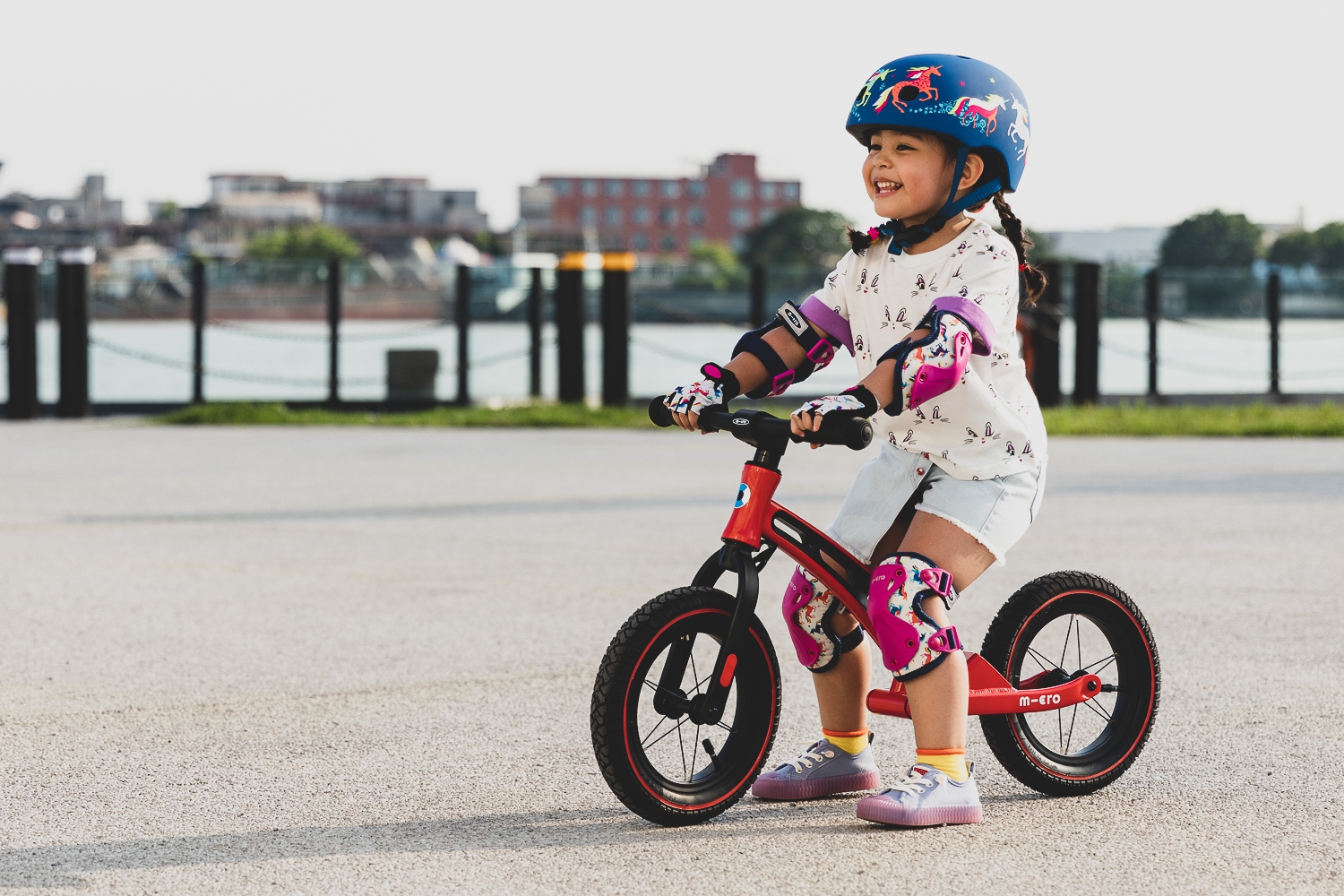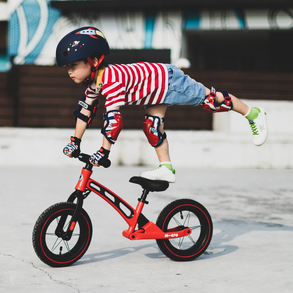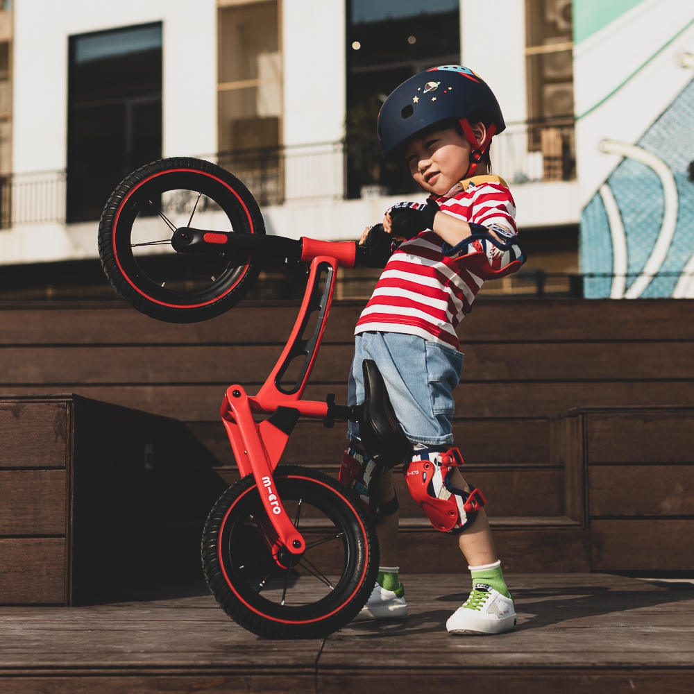 Rowerek biegowy Micro Balance Bike skonstruowany jest tak, aby utrzymanie równowagi, a także sama jazda były jak najbardziej bezpieczne. Nisko prowadzona rama ułatwia wsiadanie oraz zsiadanie, a także obniża środek ciężkości ułatwiając utrzymanie równowagi dziecku. Kierownica rowerka balansowego Micro Balance Bike Deluxe osadzona jest na mostku AHEAD, który utrzymuje ją na stałym poziomie wspierając prawidłową sylwetkę dziecka podczas jazdy na rowerku. Ponadto kierownica ma możliwość regulacji od 52 do 55 cm. Wyprofilowane gumowe uchwyty czynią chwyt pewnym, a poszerzenia na ich końcach zapobiegają zsuwaniu się dziecięcych dłoni podczas jazdy. Praktycznym rozwiązaniem jest uchwyt znajdujący się na tyle siodełka, który ułatwia jego transport, a przede wszystkim ułatwia asekurację przez opiekuna podczas pierwszych kroków na biegówce.