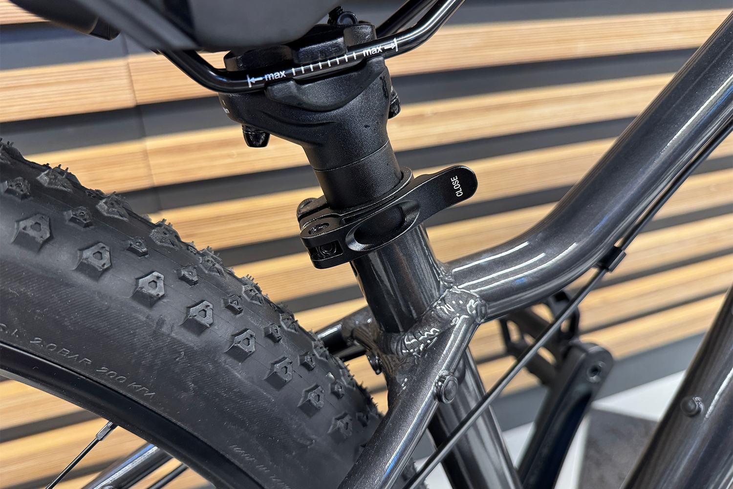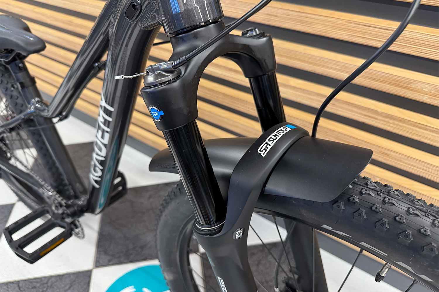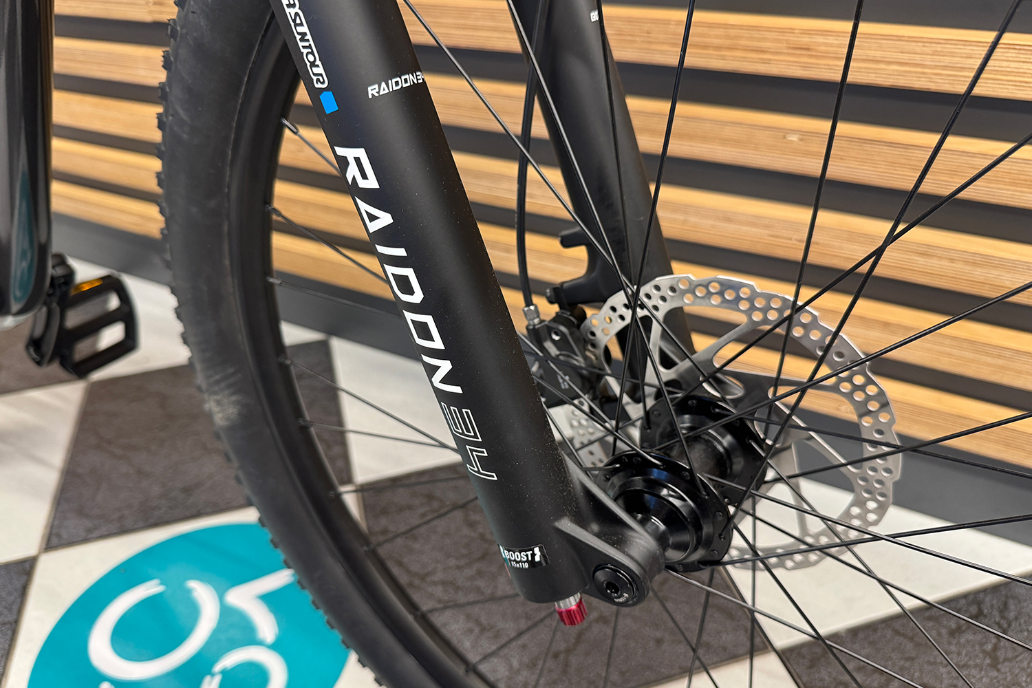 - amortyzowany olejowo-powietrzny SR Suntour SF25-RAIDON34X-BOOST, skok 100 mm. regulowane tłumienie dobicia i odbicia