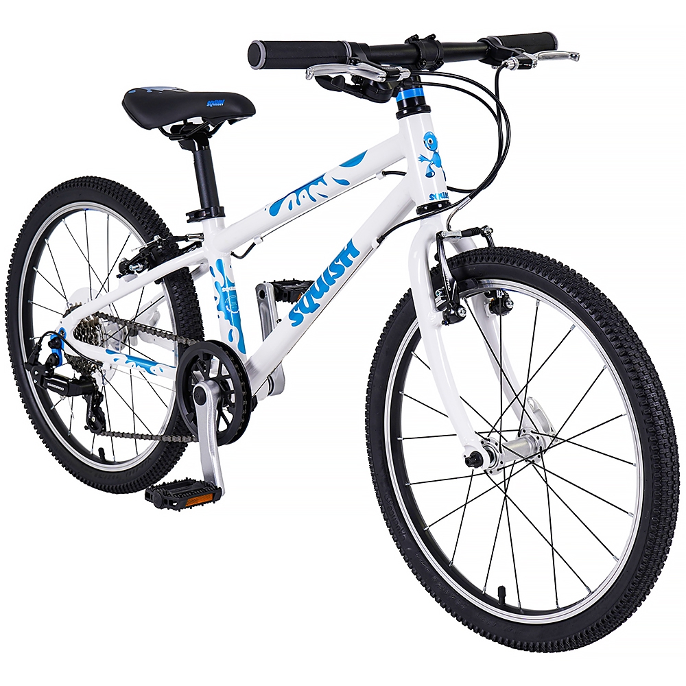 Biały dziecięcy rower Squish na 20 calowych kołach i aluminiowej 10 calowej ramie, który wyposażony został w przerzutki. 7 przełożeń, wygodne manetki. Zgadliście :) Oczywiście Shimano! Wszystkie nasze rowery pracują na osprzęcie Shimano ponieważ jest niezawodny! Potrójnie cieniowana rama, mocne hamulce v-brake, osprzęt Shimano, aluminiowy widelec, regulowana wysokość siodełka i kierownicy to najważniejsze zalety tego dziecięcego roweru. I to co zawsze podkreślany niska waga!