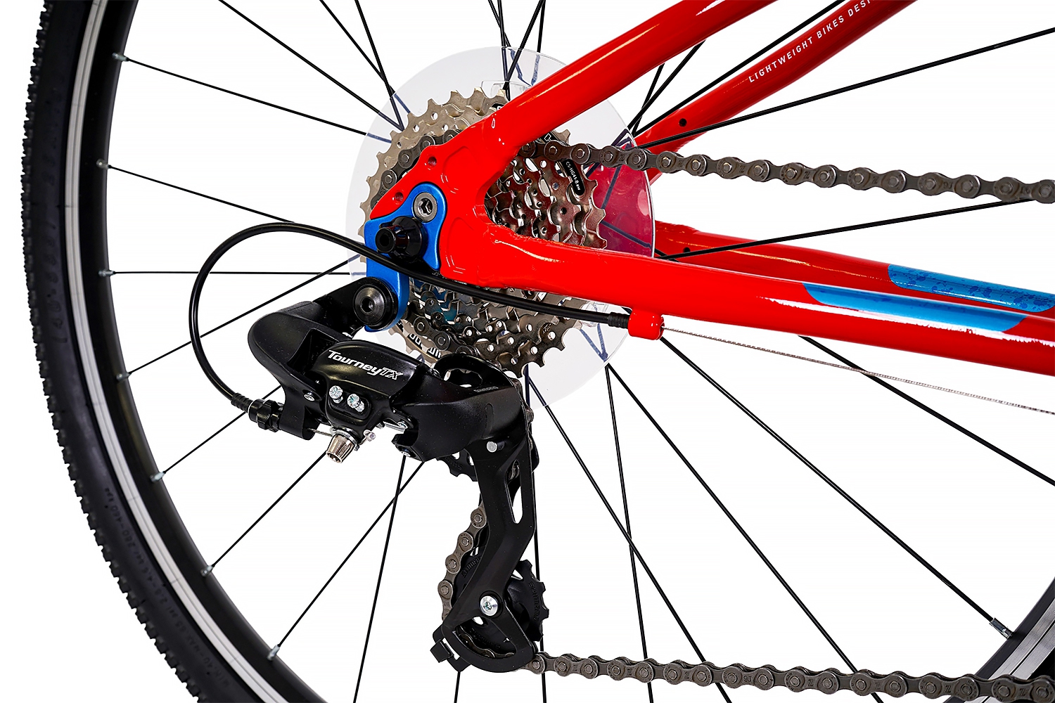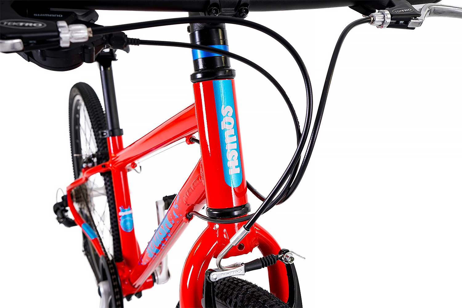 Rower dla dzieci Squish 26 posiada wysokiej jakości 8-biegową przerzutkę Shimano Tourney RD-TX800. Przerzutka obsługiwana jest klasyczną, bardzo lekko i płynnie działającą manetką na palec Shimano SL-M310. Takie rozwiązanie sprawia, iż rower jest znacznie bardziej uniwersalny oraz ułatwia pokonywanie dłuższych, bardziej wymagających tras. 8-rzędowa kaseta posiada rozstaw zębatek 11-32T co wraz z 32T zębami na korbie stanowi idealne proporcje dla młodego rowerzysty. Rower dla dzieci Squish 26 posiada także najwyższej jakości hamulce v-brake renomowanej firmy Tektro. Odpowiednio wyregulowane pozwalają bezpiecznie i płynnie zatrzymać rower z odpowiednią dla dzieci siłą. Klamki hamulcowe są specjalnie pomniejszone, aby pasowały do dziecięcych dłoni. Same klamki również można wyregulować przybliżając bądź oddalając je od kierownicy. Koła roweru dla dzieci Squish 26 o rozmiarze 26” z lekkimi, aluminiowymi obręczami i piastami posiadają wysokiej jakości, hybrydowe opony Kenda 26x1,5”. Dzięki temu sprawdzą się zarówno podczas jazdy po mieście jak i leśnych szlakach.