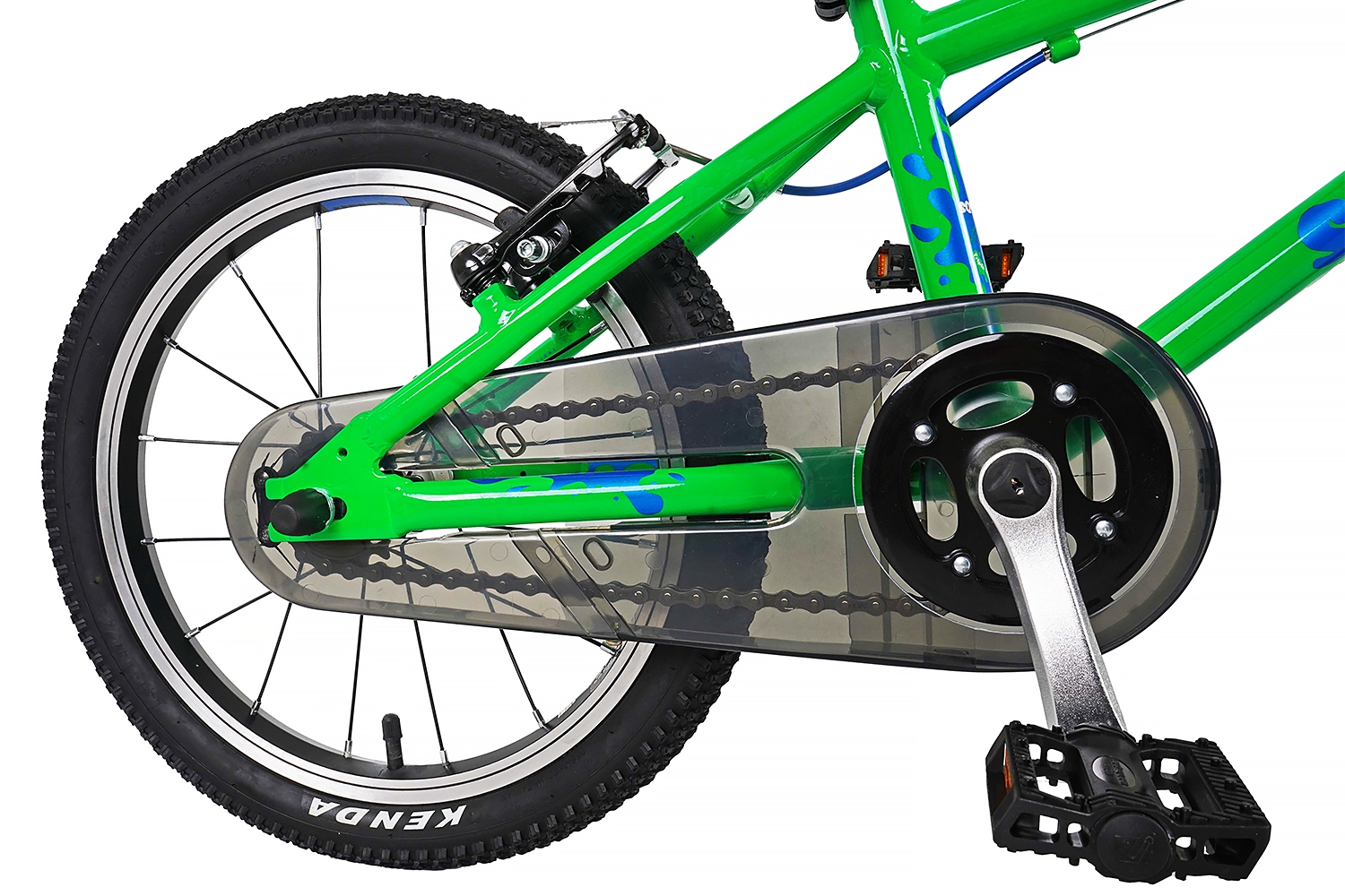 Aby ułatwić naukę jazdy oraz uczynić ją jak najbardziej przyjemną dziecięcy rower Squish 16” wyposażony jest w idealnie dopasowany, najwyższej klasy osprzęt. Napęd tego roweru dla 4latka nazywany jest wolnobiegiem, czyli bez hamulca w korbie. Specjalnie pomniejszona korba z ramionami o długości 10,2 cm wyposażona jest w 26T zębów. Wraz z 16T zębami na wolnobiegu umożliwiają płynną, przyjemną jazdę bez większego wysiłku dla malucha. Cały mechanizm napędowy jest zabezpieczony specjalną osłoną zapobiegając wkręceniu się nogawki czy innym przykrym wypadkom. Rower dla dzieci Squish 16 posiada także najwyższej jakości hamulce v-brake renomowanej firmy Tektro. Odpowiednio wyregulowane pozwalają bezpiecznie i płynnie zatrzymać rower z odpowiednią dla dzieci siłą. Klamki hamulcowe są specjalnie pomniejszone, aby pasowały do dziecięcych dłoni. Same klamki również można wyregulować przybliżając bądź oddalając je od kierownicy. Koła roweru dla dzieci Squish 16 o rozmiarze 16” z lekkimi, aluminiowymi obręczami i piastami posiadają wysokiej jakości, hybrydowe opony Kenda 16x1,5”. Dzięki temu sprawdzą się zarówno podczas jazdy po mieście jak i leśnych szlakach.