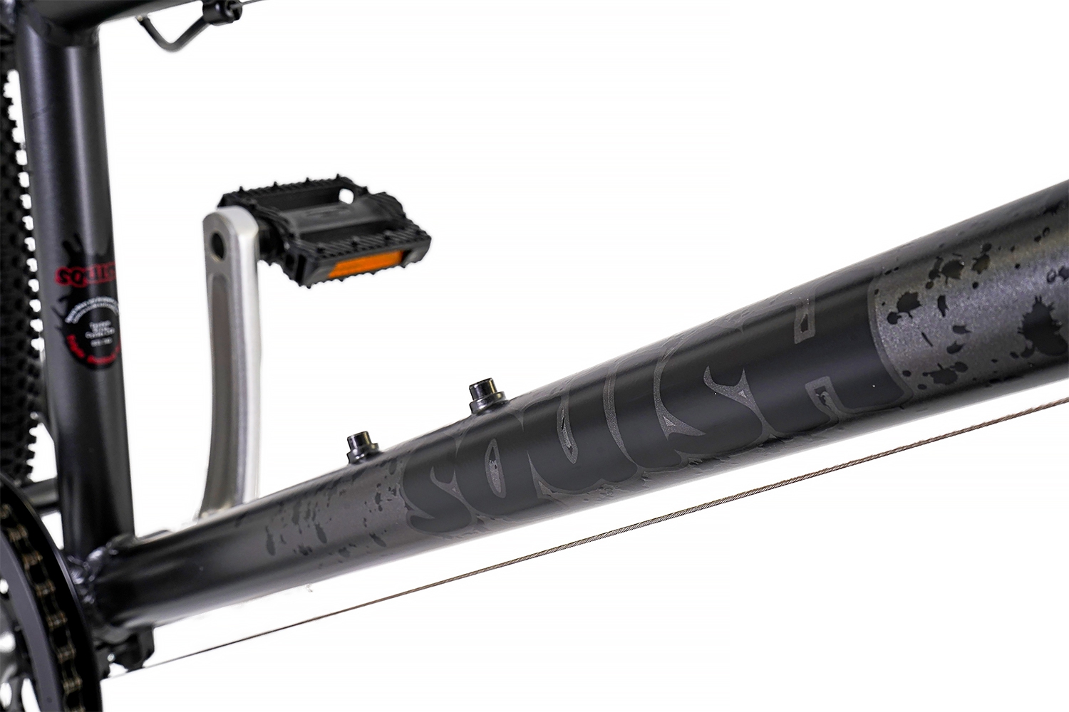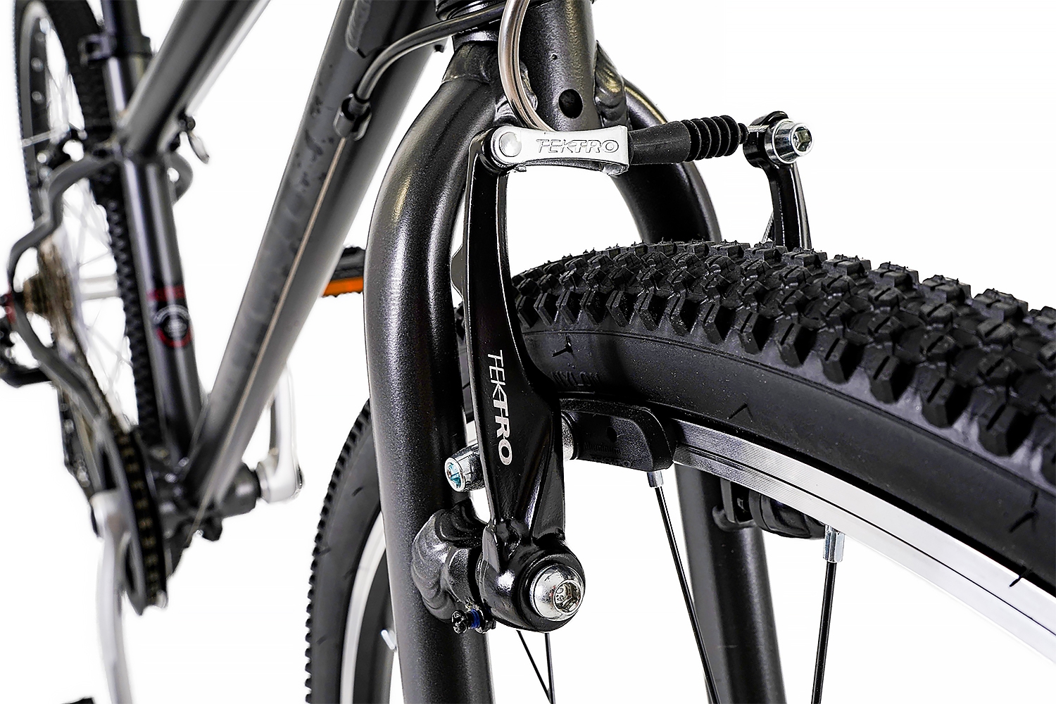 Rower dla dzieci Squish 26 posiada wysokiej jakości 8-biegową przerzutkę Shimano Tourney RD-TX800. Przerzutka obsługiwana jest klasyczną, bardzo lekko i płynnie działającą manetką na palec Shimano SL-M310. Takie rozwiązanie sprawia, iż rower jest znacznie bardziej uniwersalny oraz ułatwia pokonywanie dłuższych, bardziej wymagających tras. 8-rzędowa kaseta posiada rozstaw zębatek 11-32T co wraz z 32T zębami na korbie stanowi idealne proporcje dla młodego rowerzysty. Rower dla dzieci Squish 26 posiada także najwyższej jakości hamulce v-brake renomowanej firmy Tektro. Odpowiednio wyregulowane pozwalają bezpiecznie i płynnie zatrzymać rower z odpowiednią dla dzieci siłą. Klamki hamulcowe są specjalnie pomniejszone, aby pasowały do dziecięcych dłoni. Same klamki również można wyregulować przybliżając bądź oddalając je od kierownicy. Koła roweru dla dzieci Squish 26 o rozmiarze 26” z lekkimi, aluminiowymi obręczami i piastami posiadają wysokiej jakości, hybrydowe opony Kenda 26x1,5”. Dzięki temu sprawdzą się zarówno podczas jazdy po mieście jak i leśnych szlakach.