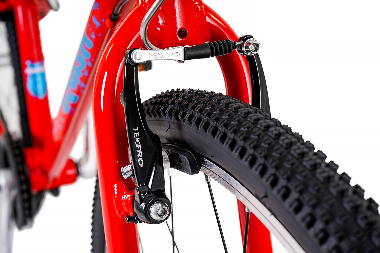 Rower dla dzieci Squish 26 posiada wysokiej jakości 8-biegową przerzutkę Shimano Tourney RD-TX800. Przerzutka obsługiwana jest klasyczną, bardzo lekko i płynnie działającą manetką na palec Shimano SL-M310. Takie rozwiązanie sprawia, iż rower jest znacznie bardziej uniwersalny oraz ułatwia pokonywanie dłuższych, bardziej wymagających tras. 8-rzędowa kaseta posiada rozstaw zębatek 11-32T co wraz z 32T zębami na korbie stanowi idealne proporcje dla młodego rowerzysty. Rower dla dzieci Squish 26 posiada także najwyższej jakości hamulce v-brake renomowanej firmy Tektro. Odpowiednio wyregulowane pozwalają bezpiecznie i płynnie zatrzymać rower z odpowiednią dla dzieci siłą. Klamki hamulcowe są specjalnie pomniejszone, aby pasowały do dziecięcych dłoni. Same klamki również można wyregulować przybliżając bądź oddalając je od kierownicy. Koła roweru dla dzieci Squish 26 o rozmiarze 26” z lekkimi, aluminiowymi obręczami i piastami posiadają wysokiej jakości, hybrydowe opony Kenda 26x1,5”. Dzięki temu sprawdzą się zarówno podczas jazdy po mieście jak i leśnych szlakach.