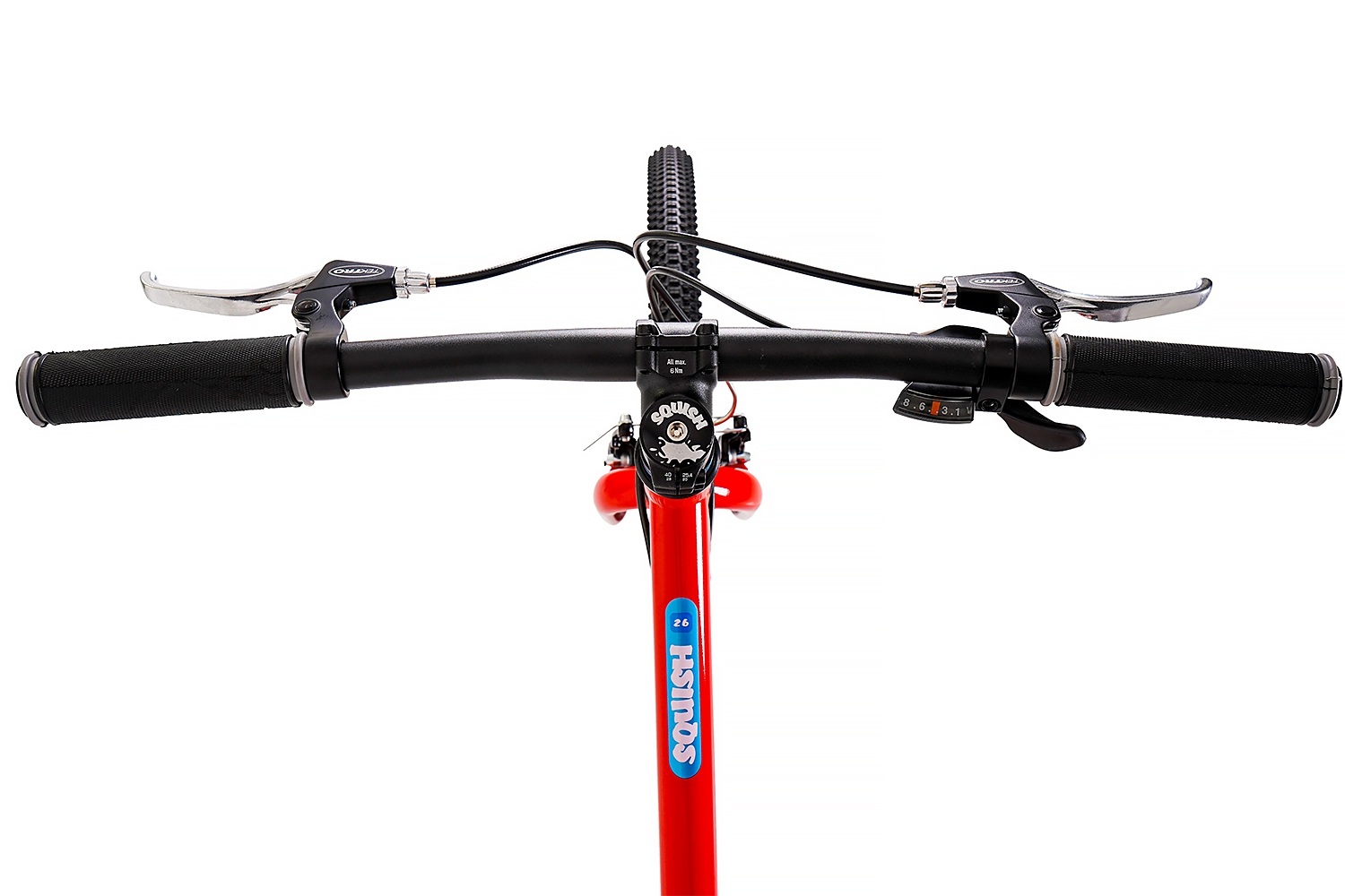 Priorytetem w rowerze dla dzieci Squish 26” jest bezpieczeństwo i wygoda młodego rowerzysty. Rower jest niezwykle lekki, aby ułatwić kontrolę i zapobiec urazom przy podczas wywrotki. Rower dziecięcy Squish 26” posiada jednak cały szereg innych rozwiązań, które sprawiają, że jazda na nim jest łatwa, lekka, a przede wszystkim bezpieczna dla każdego malucha. Podstawę komfortu stanowi ergonomiczne, bardzo wygodne siodełko z miękkiej pianki. Aby idealnie dopasować siodełko do warunków dziecka jest ono w pełni regulowane umożliwiając zmianę kąta jak i położenia względem kierownicy. A skoro już o kierownicy, w lekkim rowerze Squish 26” jest ona szeroka na 58cm zapewnia łatwe sterowanie oraz wygodną, sportową pozycję podczas jazdy. Istnieje również możliwość wyregulowania jej wysokości w zakresie 83,5 – 87 cm, a także kąta nachylenia. Za płynne kierowanie rowerem odpowiada ster a head 1 1/8” niwelując minidrgania. Uchwyty kierownicy wykonane są ze specjalnego tworzywa, które odpowiednio wyprofilowane zapewnia pewny chwyt. Na końcach uchwyty są specjalnie poszerzone, aby chronić przed ześlizgnięciem się rączki. Dziecięcy rower Squish 26” w swoim wyposażeniu posiada także dzwonek, odblaski na kołach, kierownicy oraz siodełku czyniąc pojazd jeszcze lepiej widocznym oraz słyszalnym zwiększając poziom bezpieczeństwa. W pudełku znajdziemy też squishowe naklejki pozwalając upiększyć swój rower czy też szafkę w pokoju :)